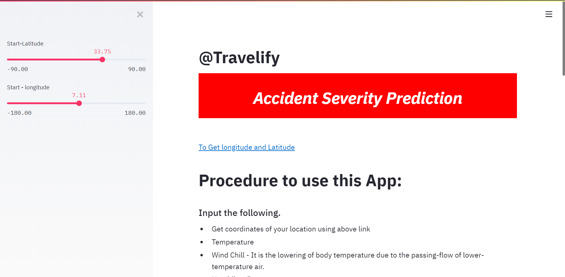 According to the idea, a website is implemented that makes use of various parameters like latitude longitude, Humidity, Pressure, etc. A statistical machine learning model built using python is employed for the prediction of chances and severity of an accident using the parameters as input.