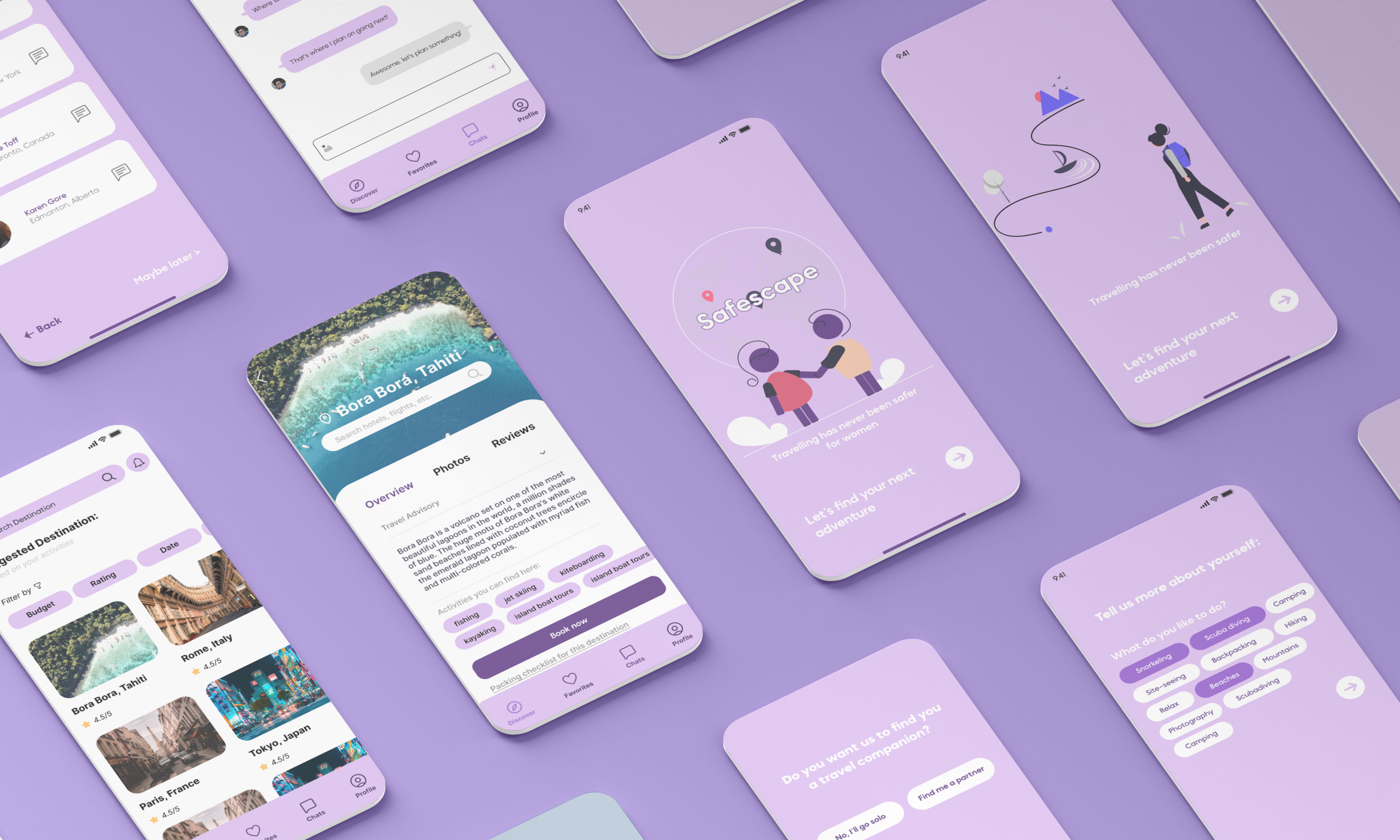 Safescape is a mobile app that takes the pain out of travel research for solo female travelers, and recommend destinations specific to their travel preference and interests. The role of this platform is to curate a list of destinations, help solo female travellers feel safe by creating a safe space for them to connect with other travelers.