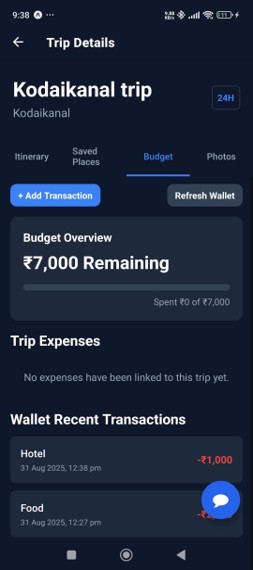 It integrates trip planning, budget tracking, fuel finding, offline photo storage, maps, and an AI chatbot for a seamless travel experience.