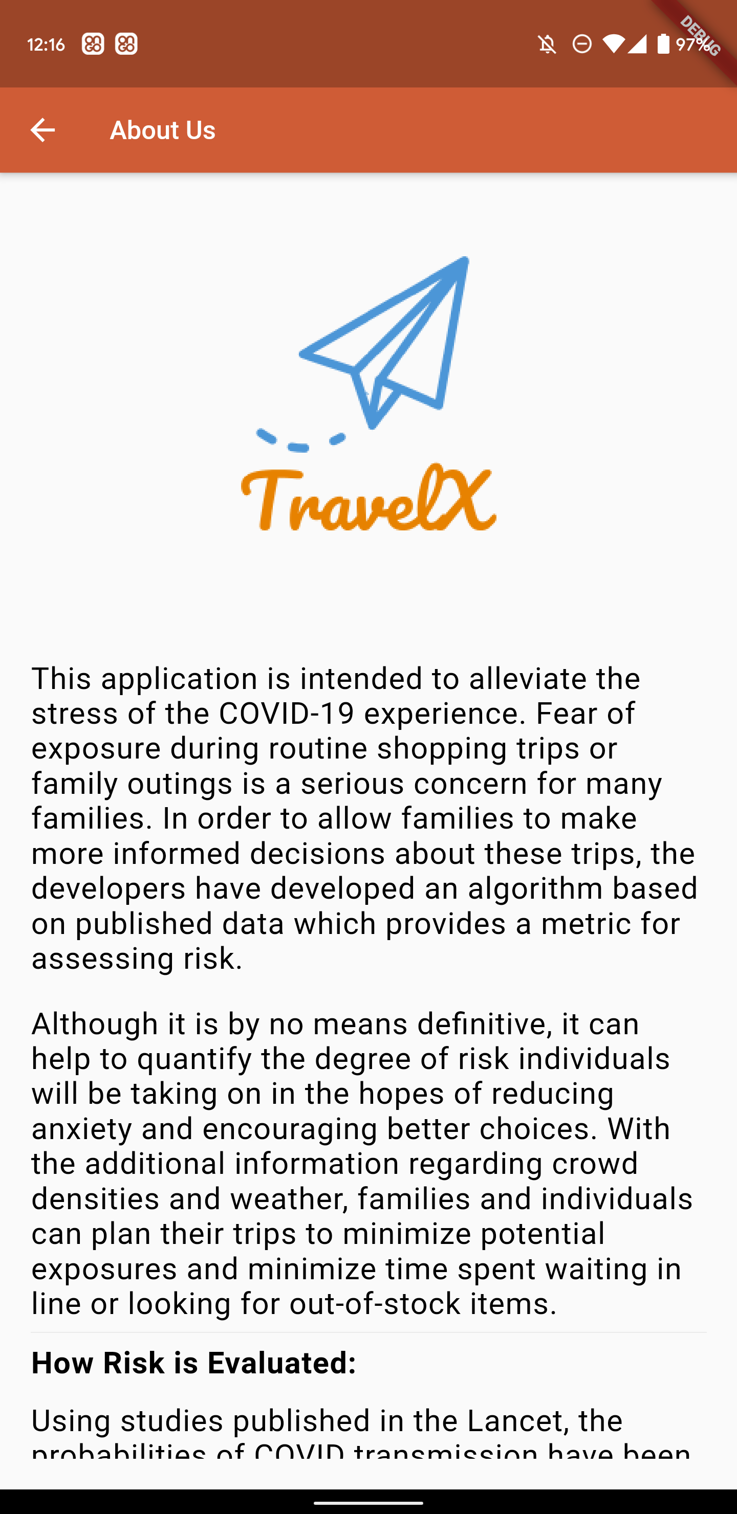 TravelX is intended to alleviate the stress of the COVID-19 experience. Fear of exposure during routine shopping trips or family outings is a serious concern for many families. In order to allow families to make more informed decisions about these trips, the developers have developed an algorithm based on published data which provides a metric for assessing risk using crowd reporting. Although it is by no means definitive, it can help to quantify the degree of risk individuals will be taking on in the hopes of reducing anxiety and encouraging better choices. With the additional information regarding crowd densities and weather, families and individuals can plan their trips to minimize potential exposures and minimize time spent waiting in line or looking for out-of-stock items.