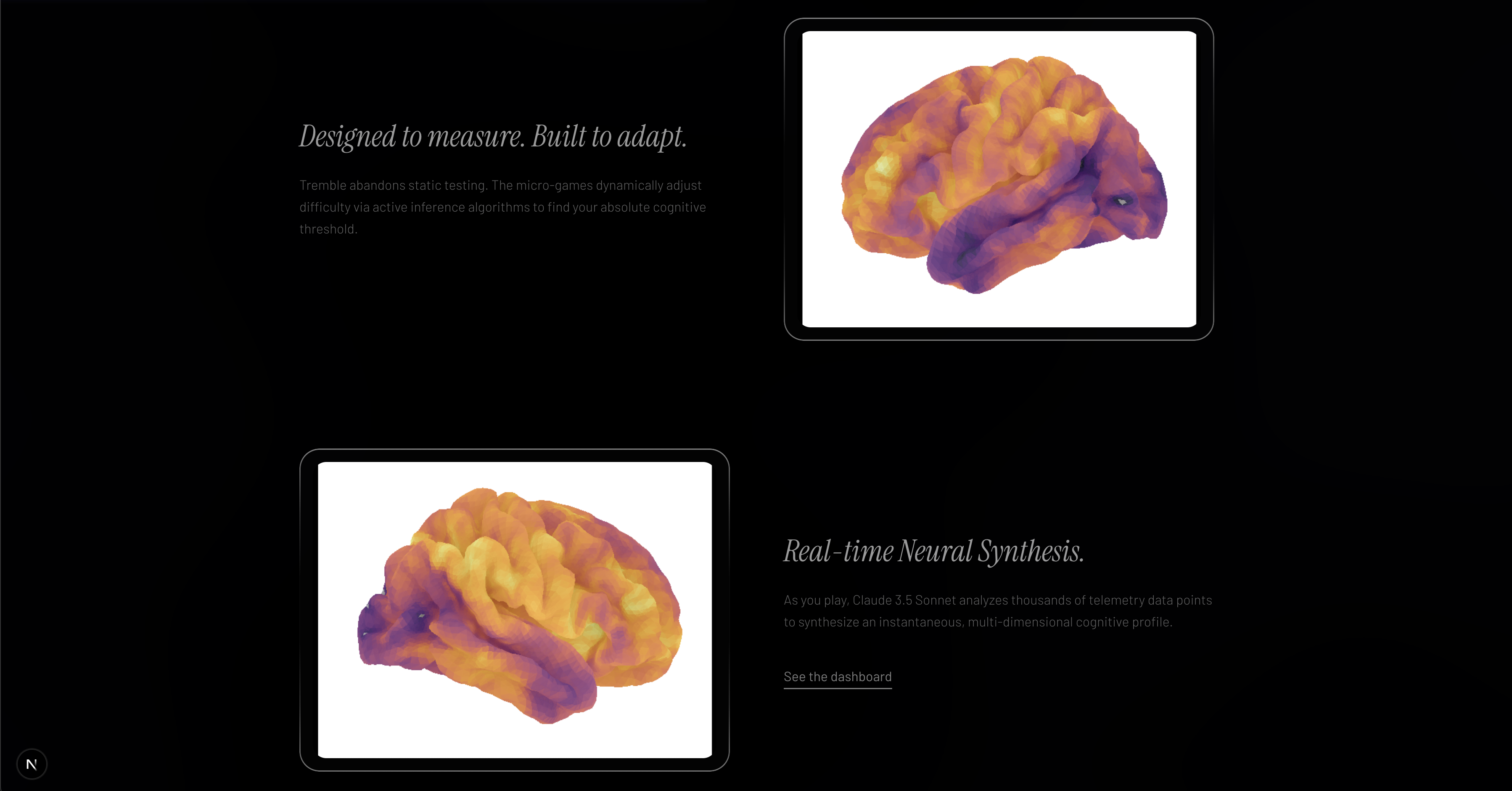 The system actually works end to end. You can play the games, get scored against real national data, see your brain activation regions light up, and receive a genuinely personalized AI report — not generic advice, but insights tied to your specific patterns. The fact that the model gets smarter with each session and starts giving you predictions before you even play is something we're really proud of.