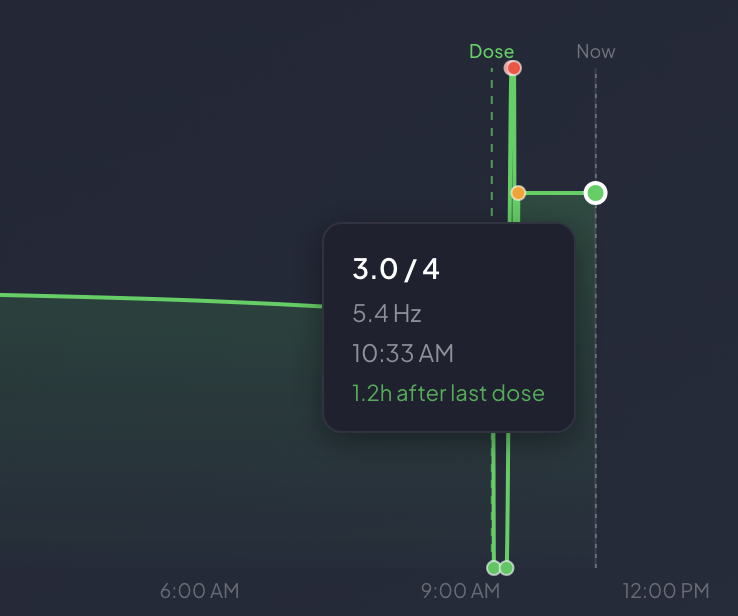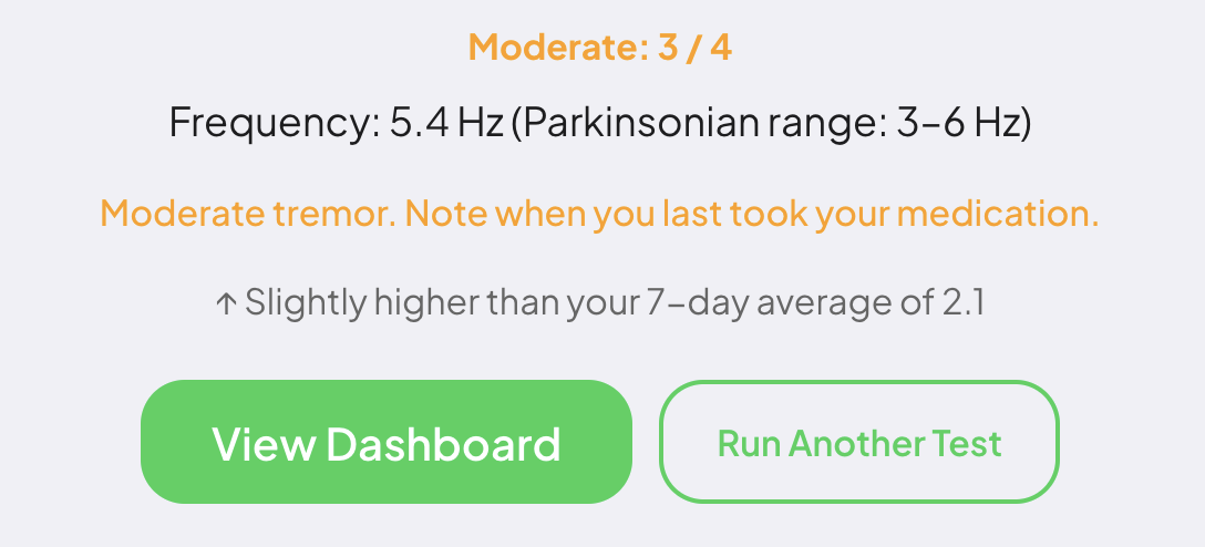Over days and weeks it reveals the medicine's ON/OFF cycles tremor rising before each dose, falling after it kicks in, rising again as it wears off. This pattern is invisible to most care teams. Now it's visible at home, every day, for free.