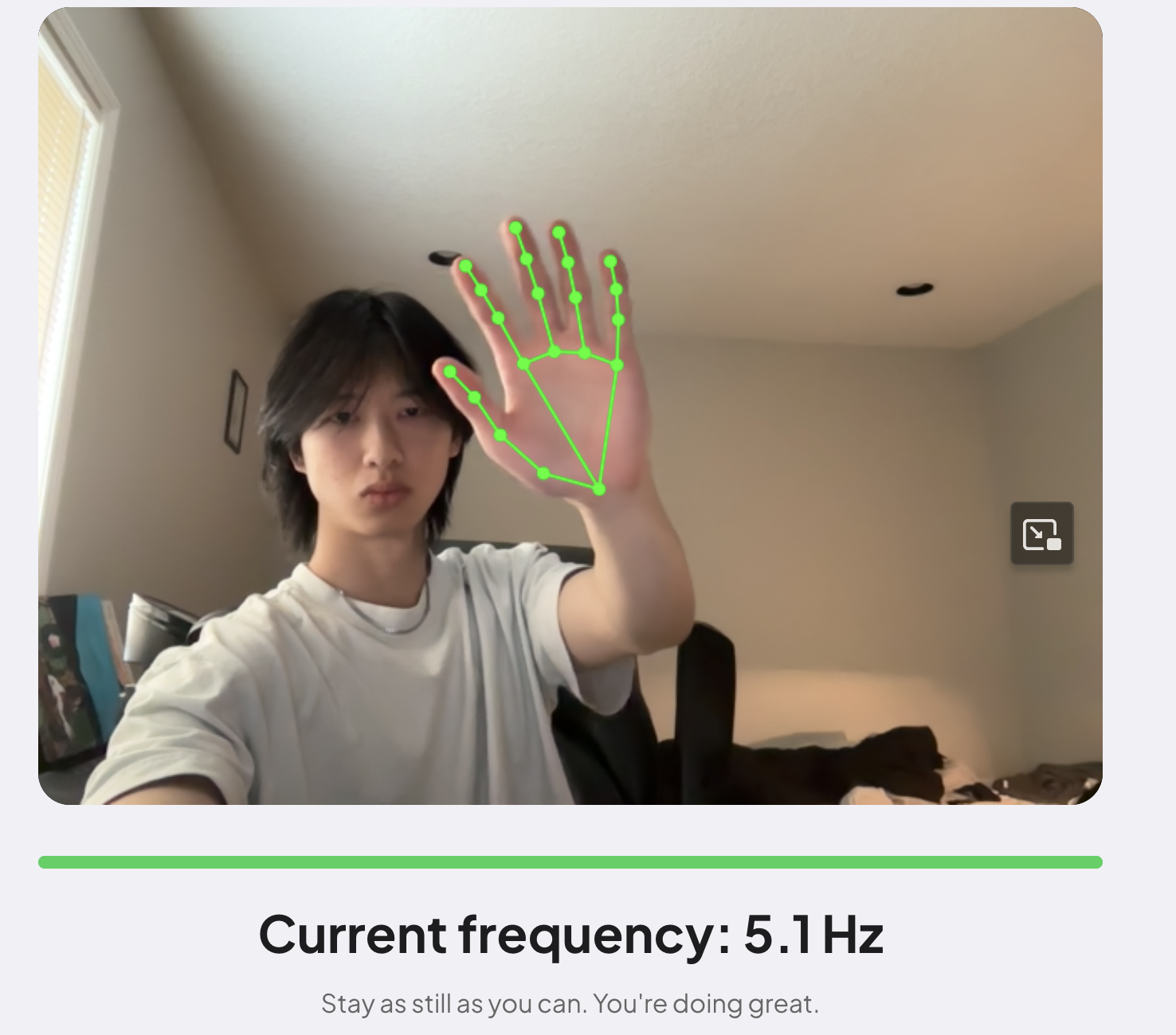 TremorTrack replicates the MDS-UPDRS Part III postural tremor test, the exact assessment neurologists use, in 15 seconds, using just a webcam. Hold your hand up toward the screen and the app measures tremor frequency in Hz and scores it on the clinical 0–4 scale.