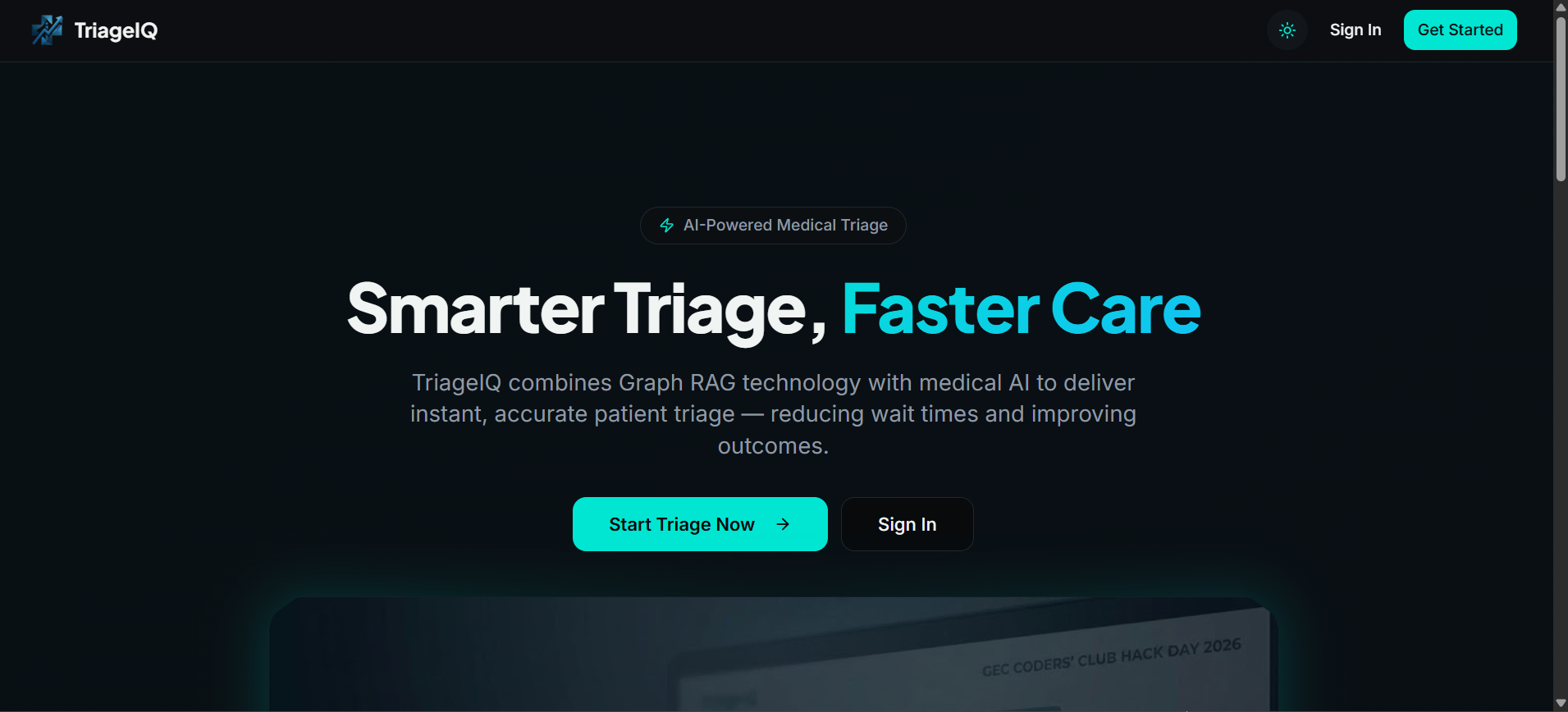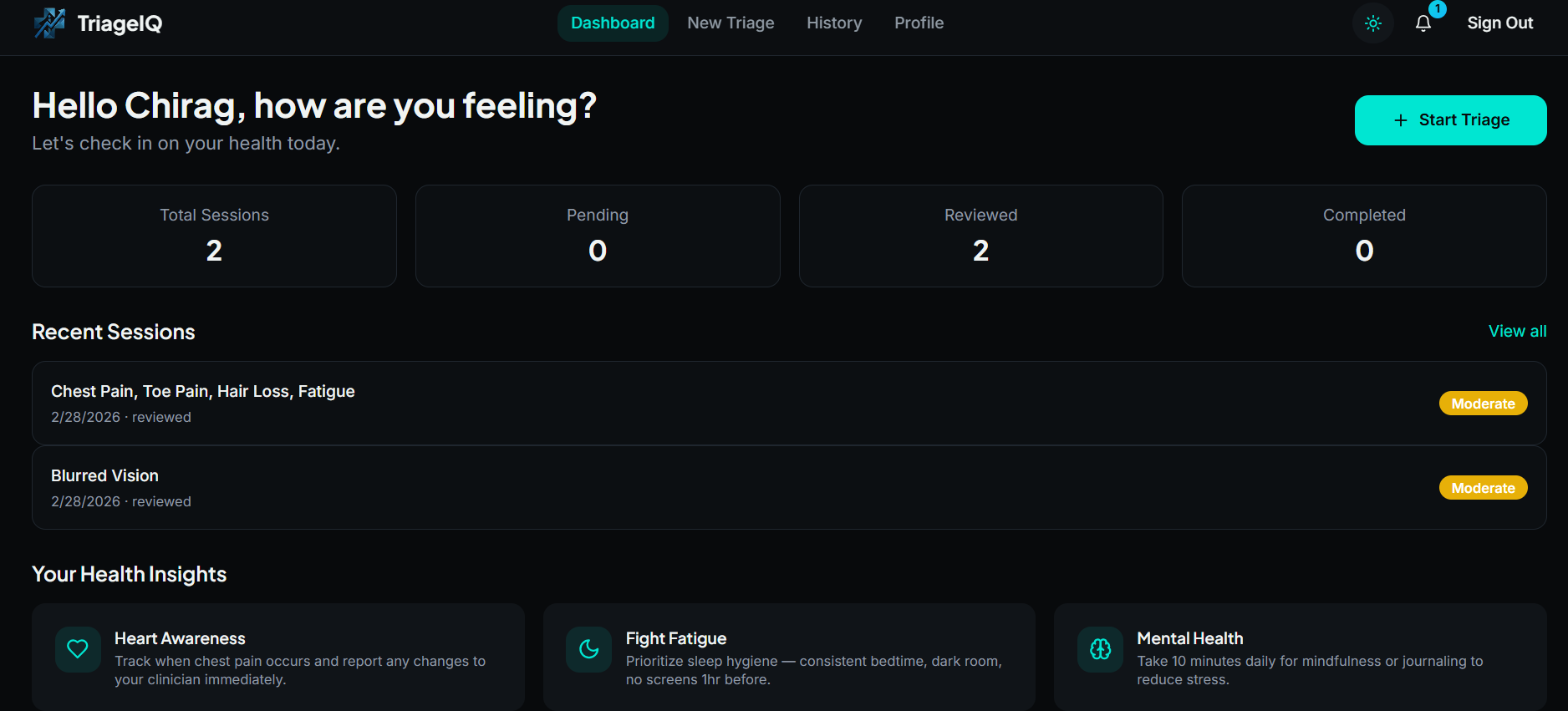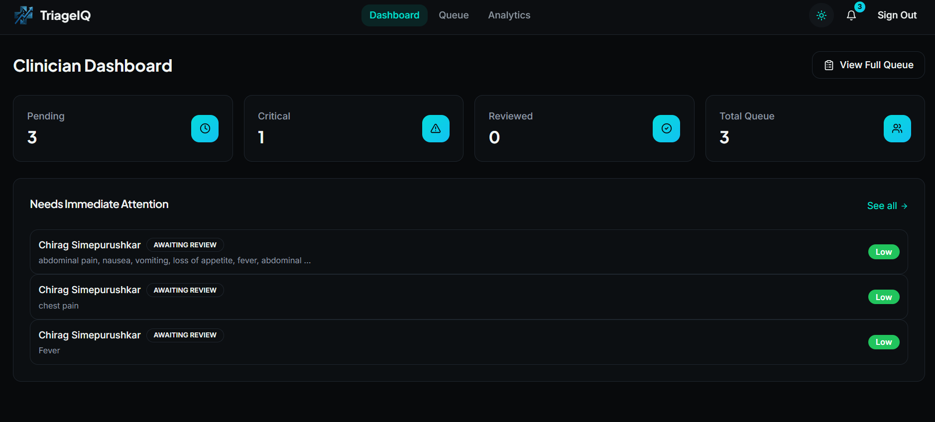 What's next for TriageIQ: Clinical Decision Support WebSockets Migration: We want to move the Clinician Dashboard from HTTP polling to WebSockets (Socket.io) so that when a Level 1 Critical patient enters the queue, the clinician's screen flashes instantly. Vector Retrieval: We plan to transition our deterministic knowledge graph mapping to use Vector Embeddings (like MongoDB Atlas Vector Search) so that fuzzy semantic matching becomes much more accurate than simple string comparisons. EHR Interoperability: Integrating FHIR standard endpoints so our AI-generated triage summaries can connect seamlessly into hospital systems like Epic or Cerner.