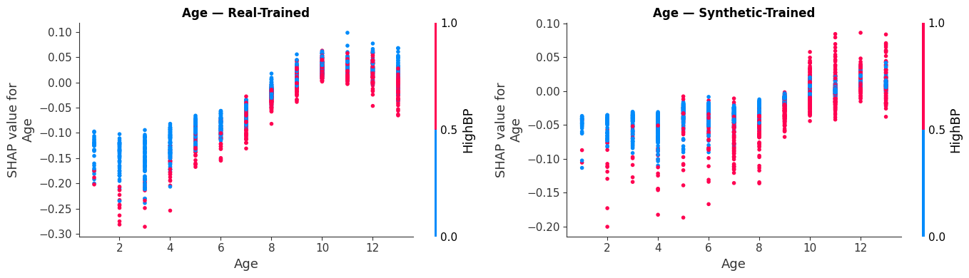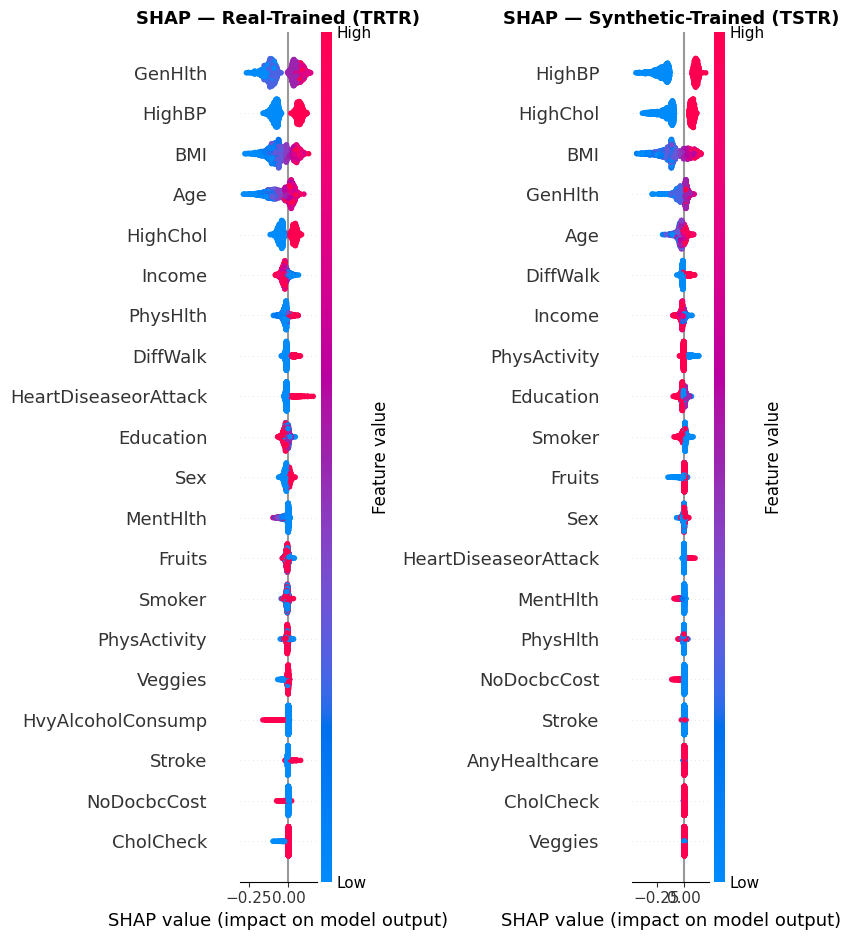 Comparing SHAP beeswarms to ensure our synthetic-trained model mirrors the clinical logic of real-world data.
