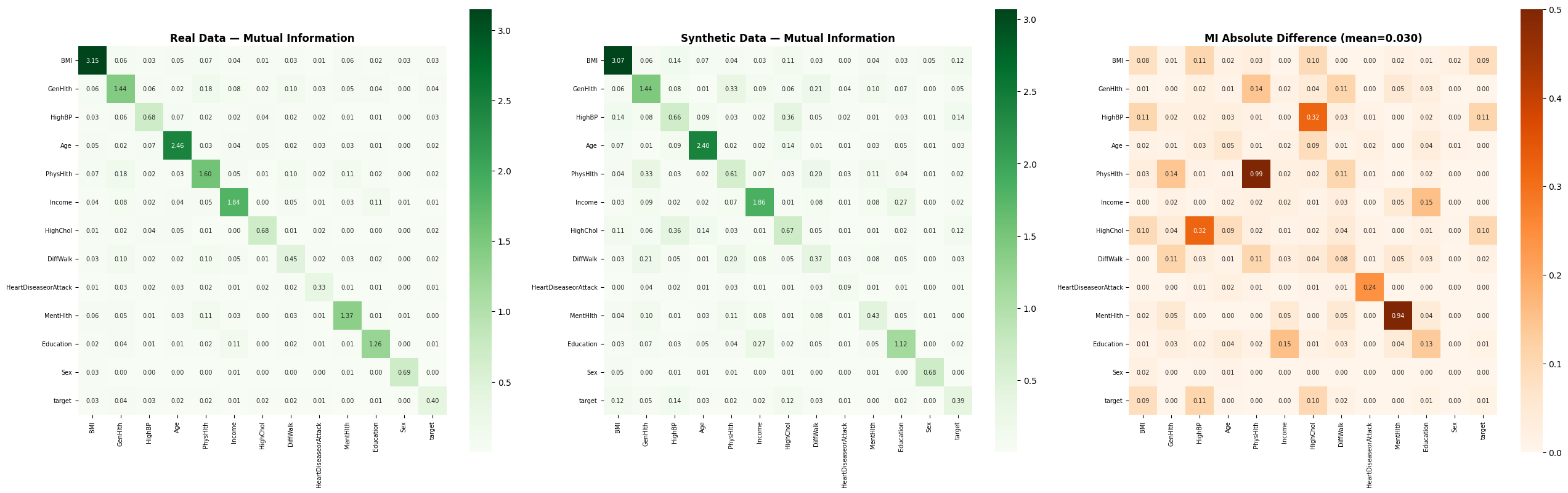 Mutual Information fidelity maps (mean diff: 0.029) confirm the "hidden DNA" of health markers is preserved.