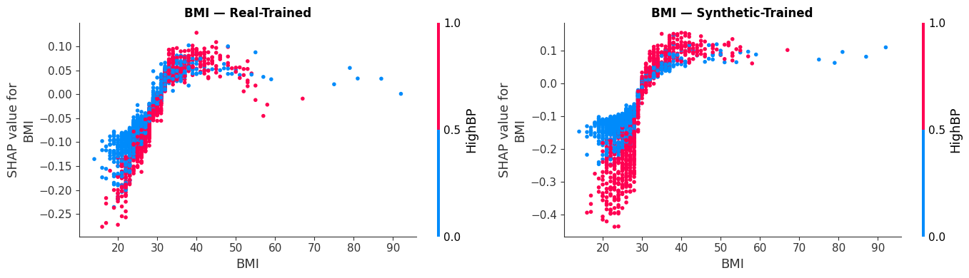 Dependence plots illustrating how BMI and HighBP interact to drive risk, validating our model's non-linear reasoning.