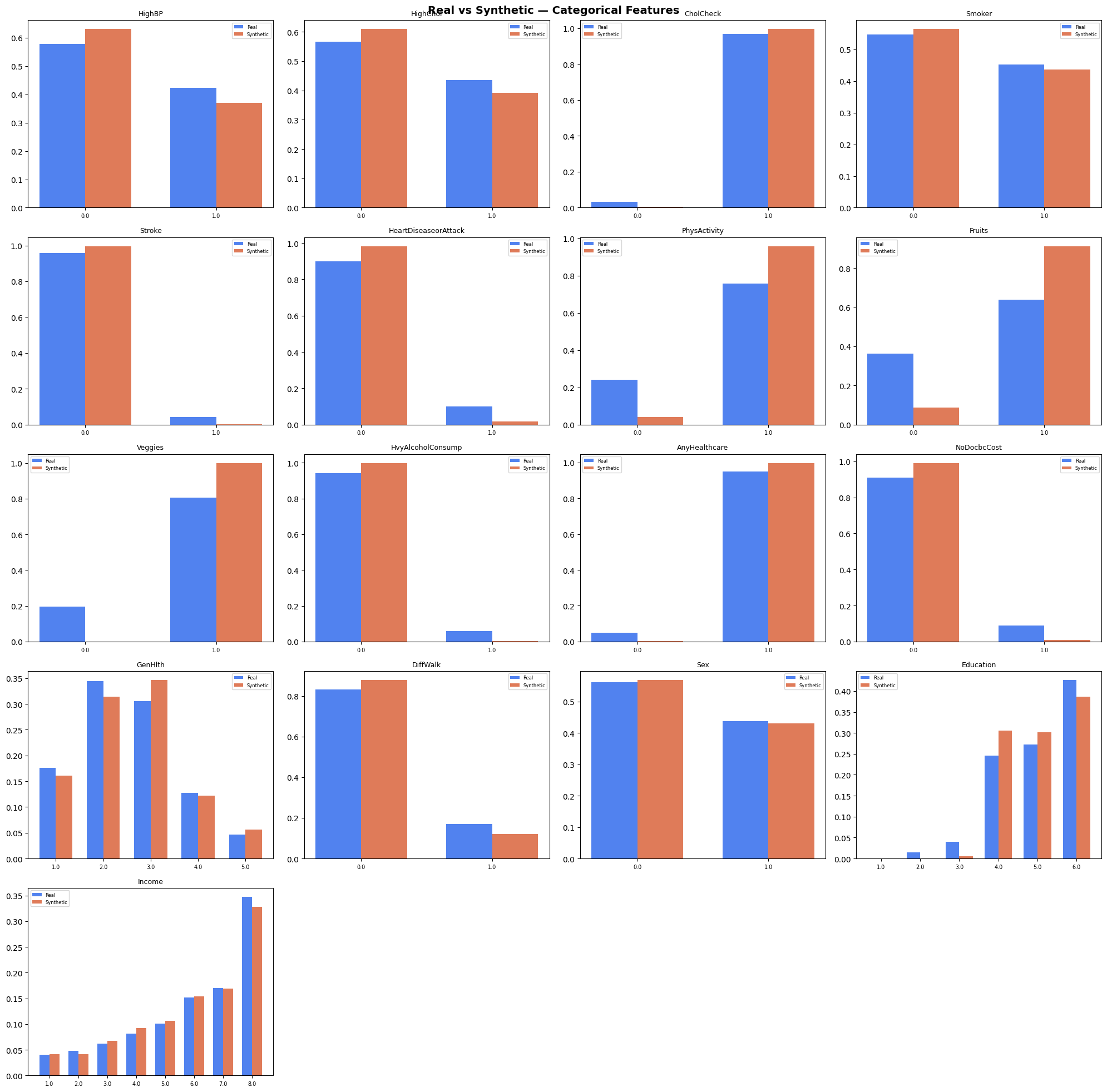 High-fidelity distribution matching across 10,000 patients, proving our TVAE successfully cloned the BRFSS cohort.