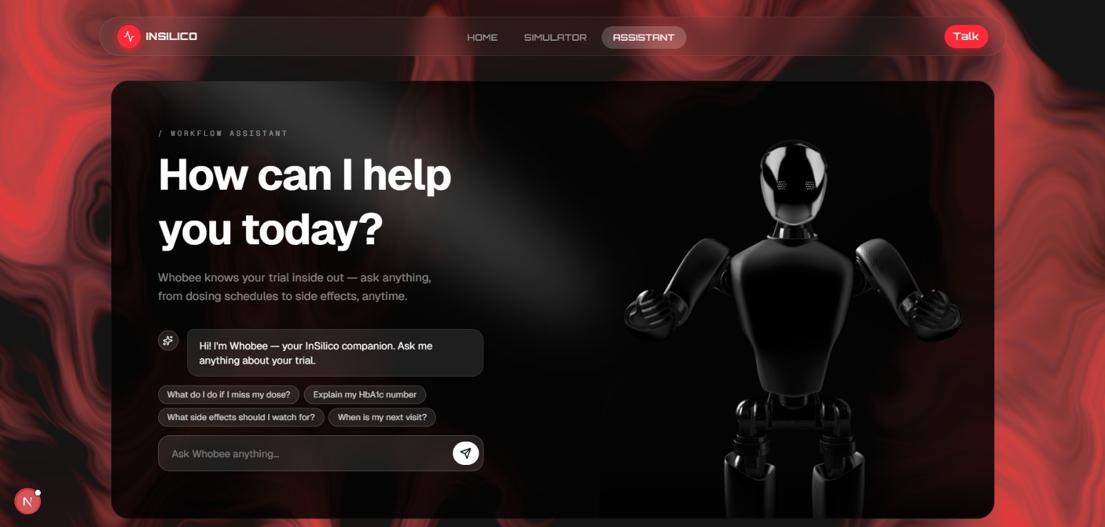 Alongside the simulator, we built Whobee, a patient-facing companion chatbot. The simulator is for the analyst deciding whether a trial is worth running. Whobee is for the patient actually enrolled in it "what do I do if I miss my dose?", "explain my HbA1c number" answered in plain language, grounded in the trial's own protocol.