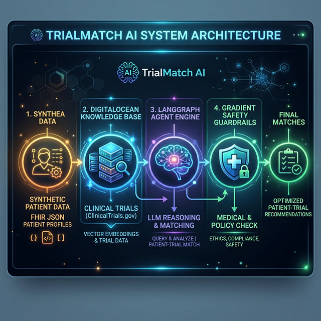 openai-gpt-oss-120bmodel. The backend parses raw FHIR JSON into a clean patient summary and sends it to the Agent. - Prompt Engineering & Reasoning: The Agent is instructed to use "Chain of Thought" reasoning to compare the semantic context of the patient's record against the retrieved trials, providing deep, contextual matching beyond simple keyword overlaps.