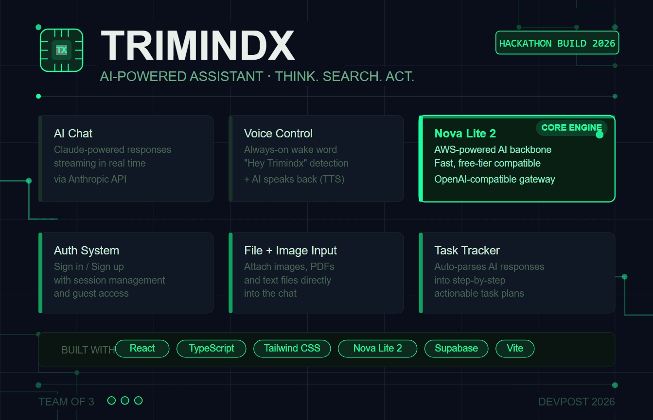We always found ourselves jumping between too many tabs — a search engine here, an AI chat there, a browser window somewhere else. It felt inefficient. We thought, why can't one tool just handle all of this? That question is what started TrimindX AI. We wanted to build something that felt less like an app and more like a smart assistant that actually lives in your workflow.