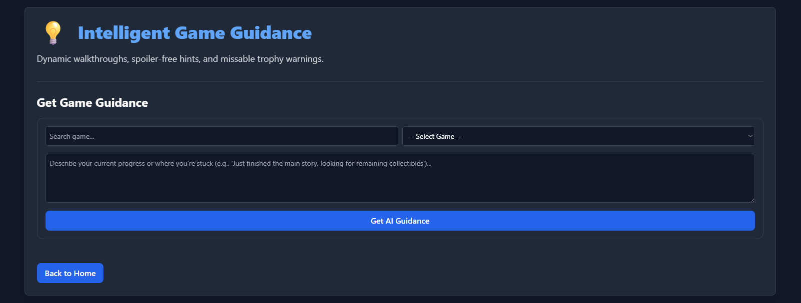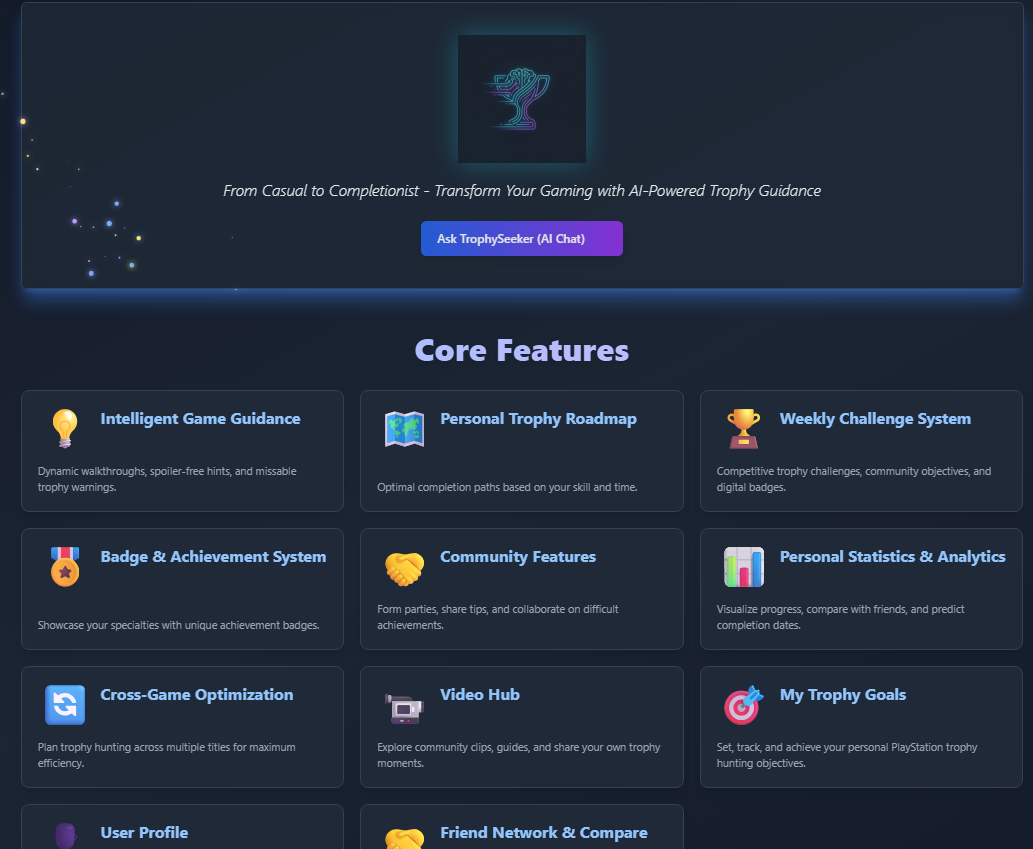 - 🤖 AI Guide Chatbot: An expert assistant available 24/7 to help you find specific trophies, explain requirements, and provide missable warnings.