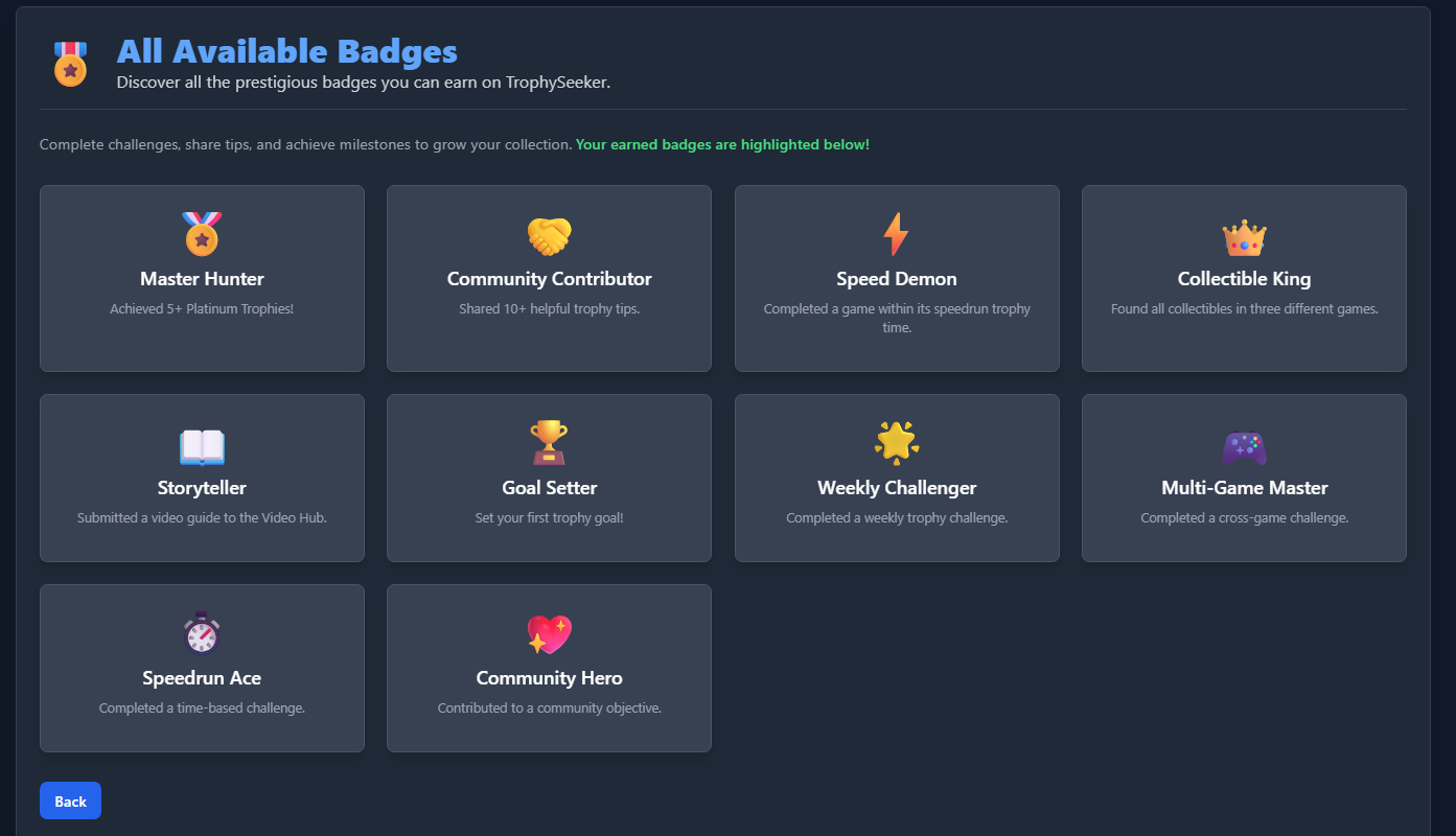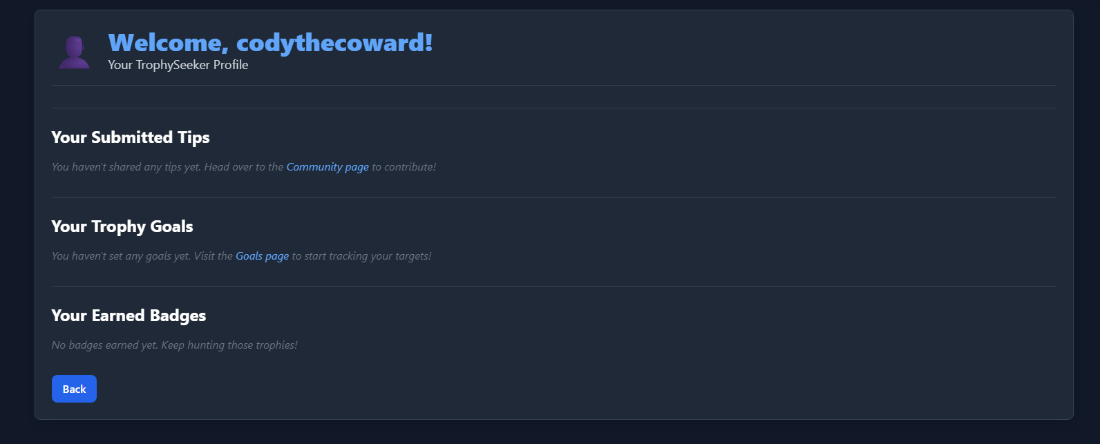 - 📊 Personal Analytics: A premium dashboard visualizing your global trophy counts, badge progress, and hunting milestones.
