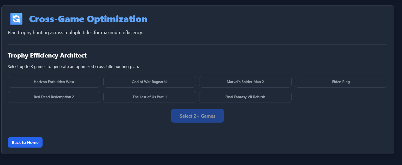 - 🔄 Cross-Game Optimization: (Experimental) A smart architect that plans your trophy hunting across multiple titles to prevent burnout.