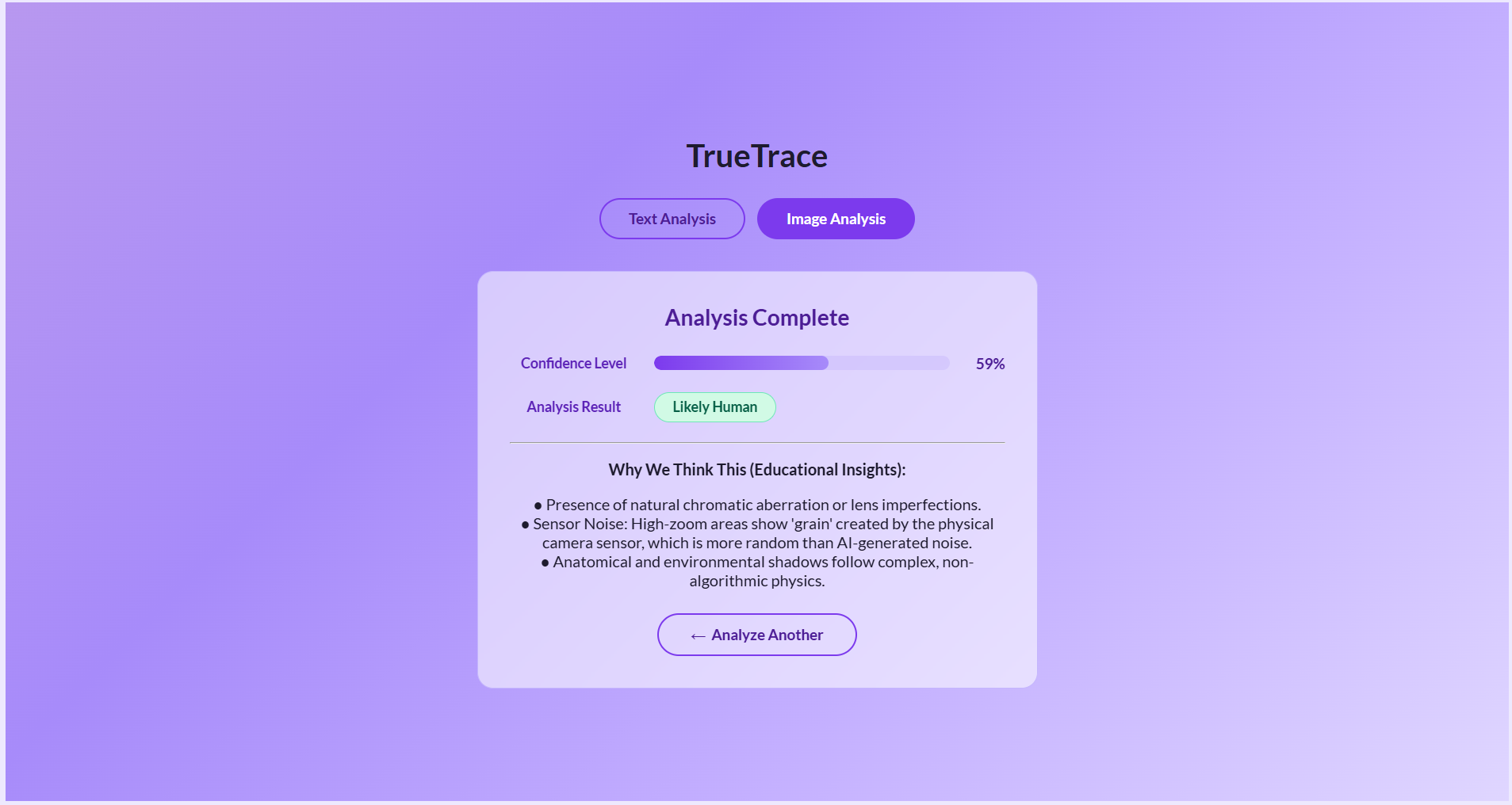 Our program is an AI detector that detects if an image or text is truly human-written or, in fact, hidden by AI's creation. It scans for "digital scars" like pixel glitches, lighting errors, and mathematical patterns that AI (like SDXL) leaves behind. And for text analysis, it flags robotic sentence structures and repetitive patterns that prove a person didn’t write the content.