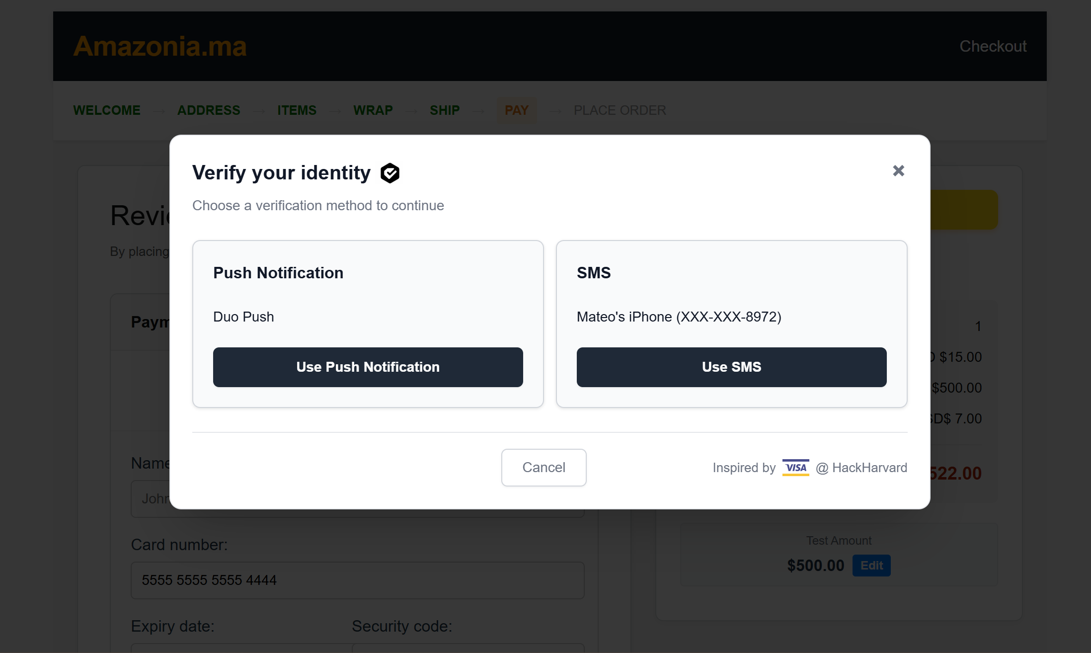 Our app leverages a lightweight Flask backend, a React-based frontend library, and a MongoDB Atlas database. Users can choose to authenticate through SMS or mobile push, powered by Cisco's Duo authorizer.