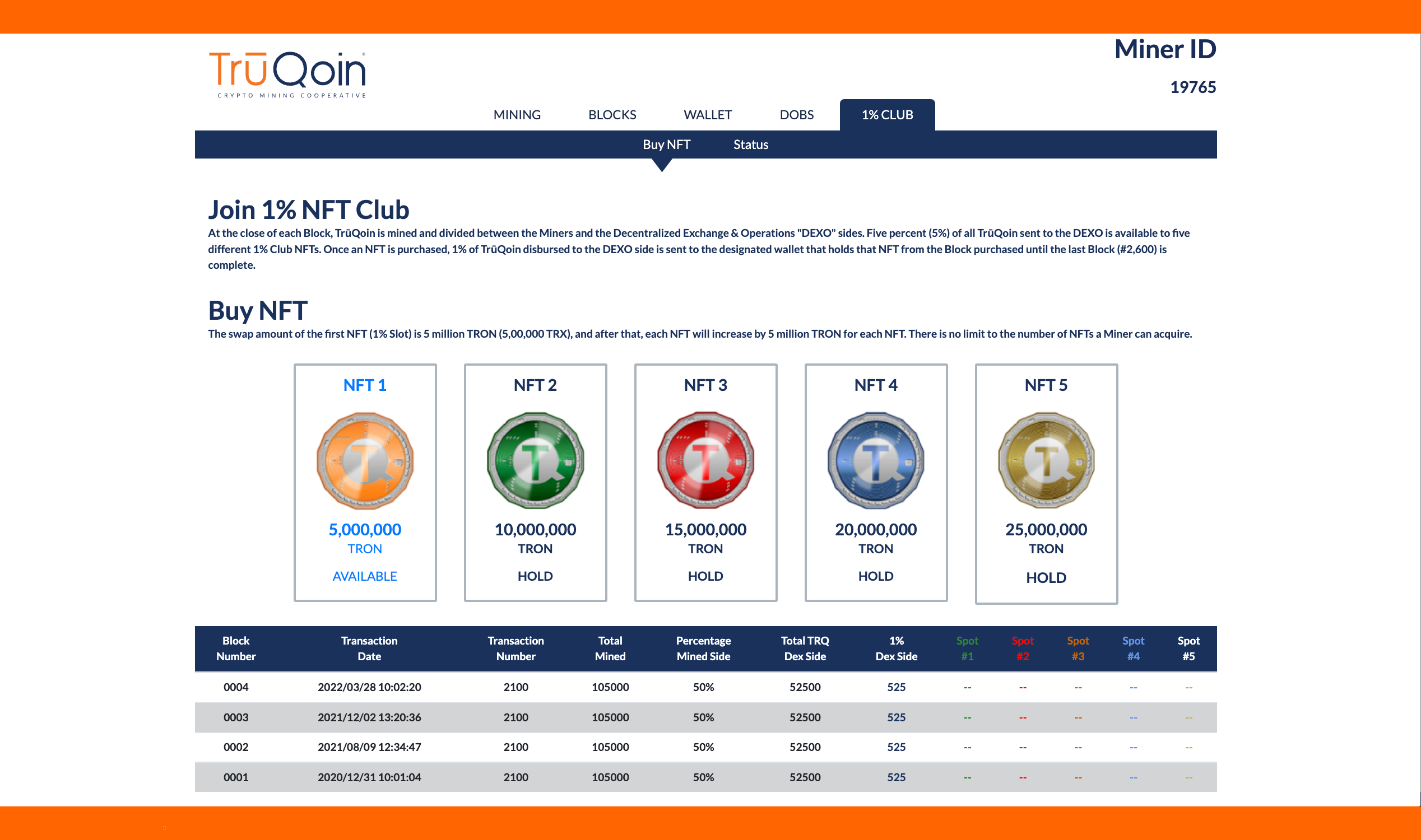 At the close of each Block, TrūQoin is mined and divided between the Miners and the Dex/Operations "DEXO" sides. Five percent (5%) of all TrūQoin sent to the DEXO is available to five different 1% Club NFTs. Once an NFT is purchased, 1% of TrūQoin disbursed to the DEXO side is sent to the designated wallet that holds that NFT from the Block purchased until the last Block (#2,600) is complete. The split between the Miners and the DEXO can change each Block. The Maximum is 50% to a minimum of 10% of each Block will go to the DEXO and 1% of that disbursement can go to each of the 5 NFT that is acquired.