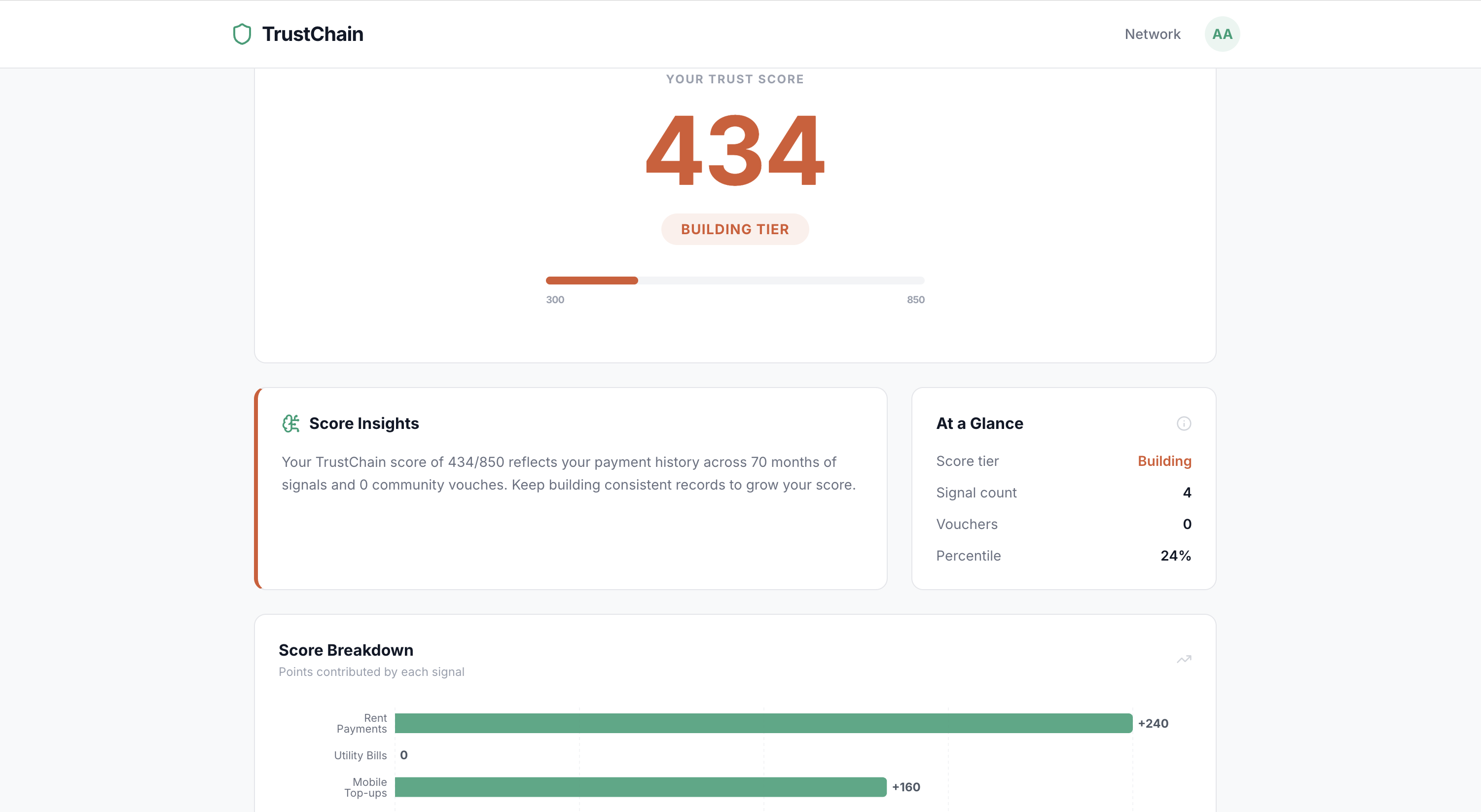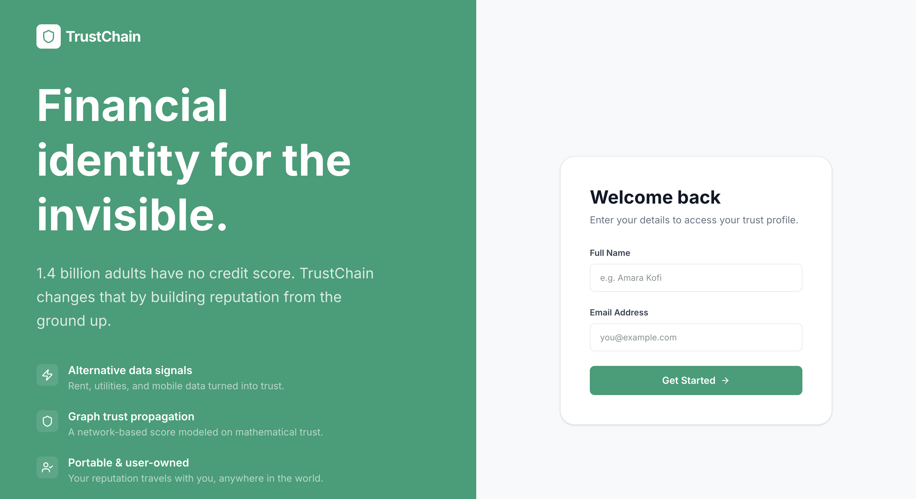 TrustChain builds a portable, user-owned trust score (300-850) from alternative behavioral data and community vouching: