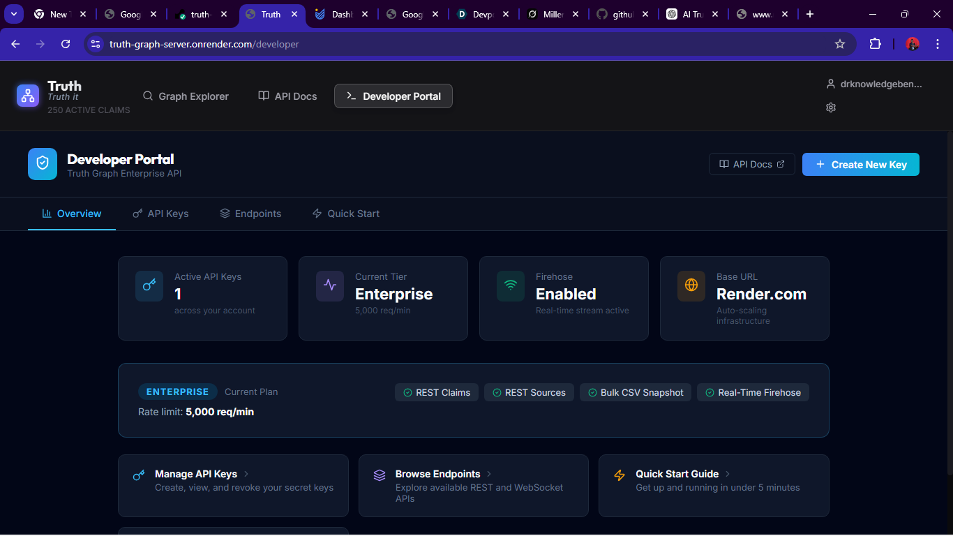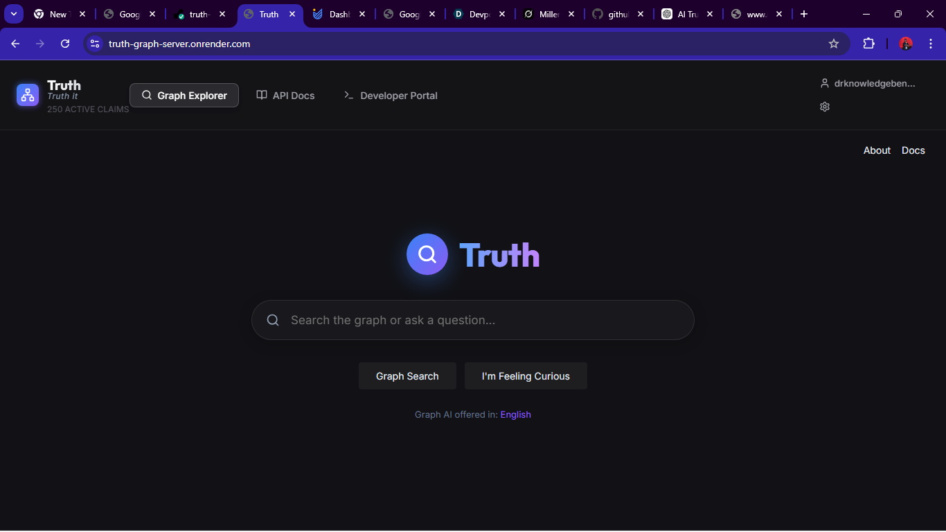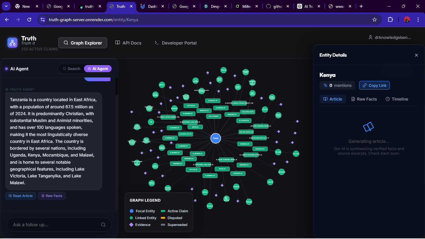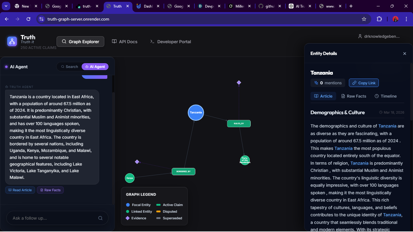 Together, these components make Truth a “living graph” that continuously updates. The system is currently deployed at truth-graph-server.onrender.com. All interactions (search, chat, graph) rely on the combined AI+graph backend to ensure every statement is traceable.