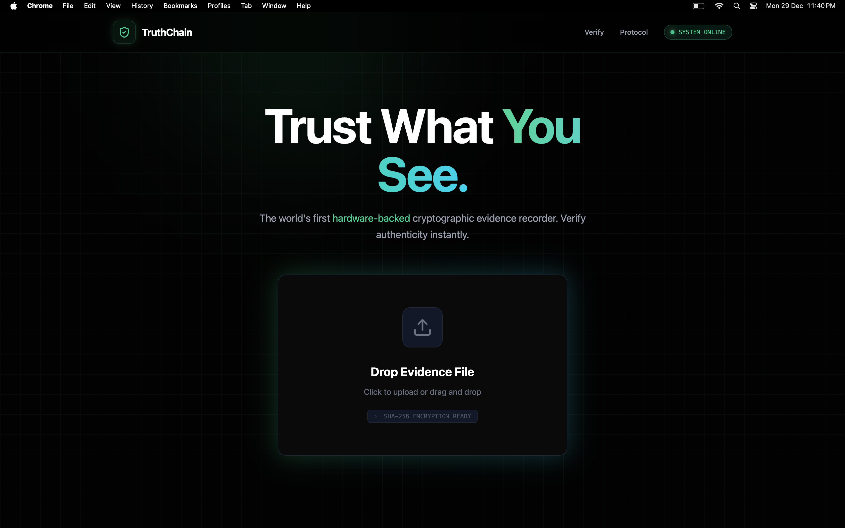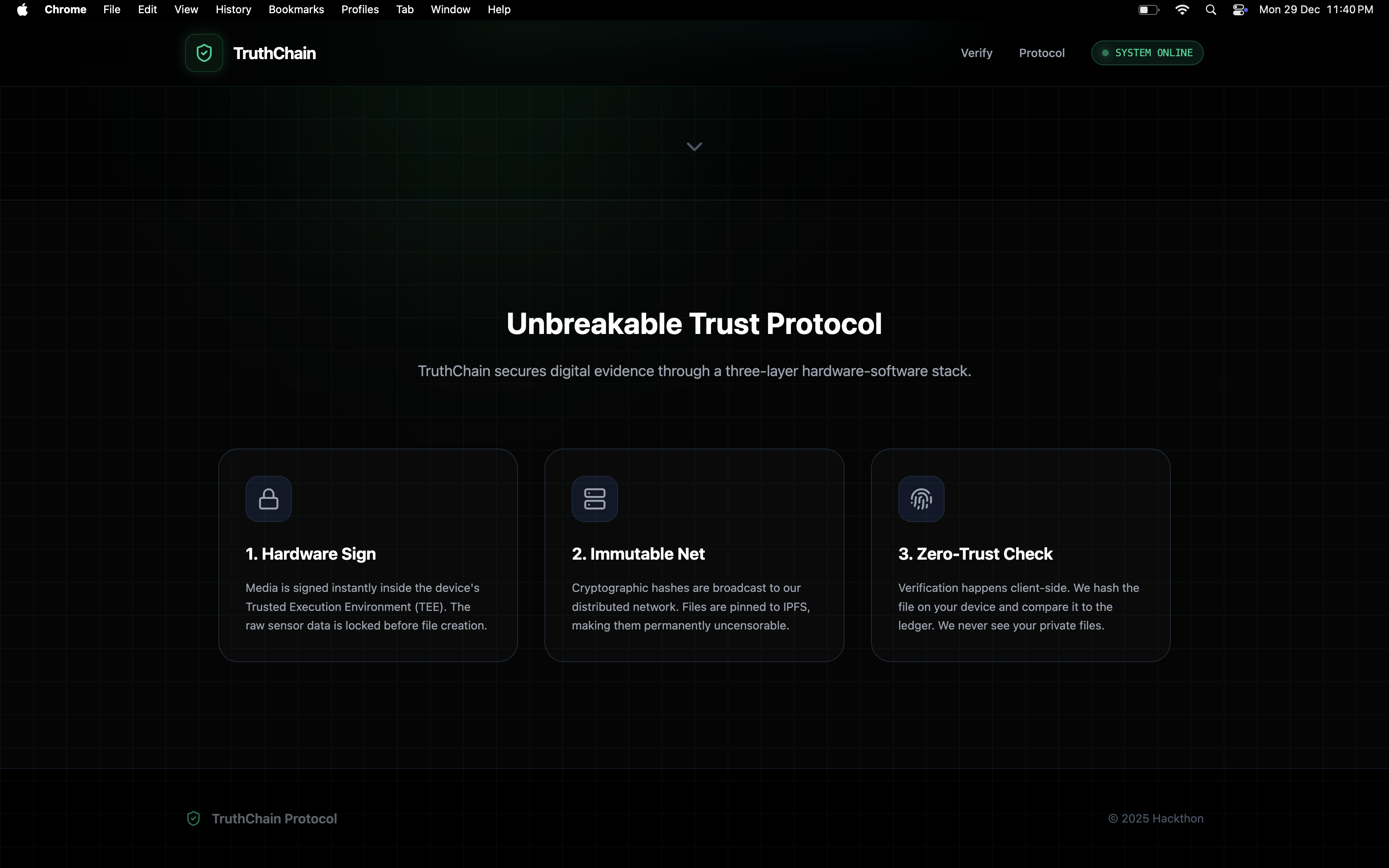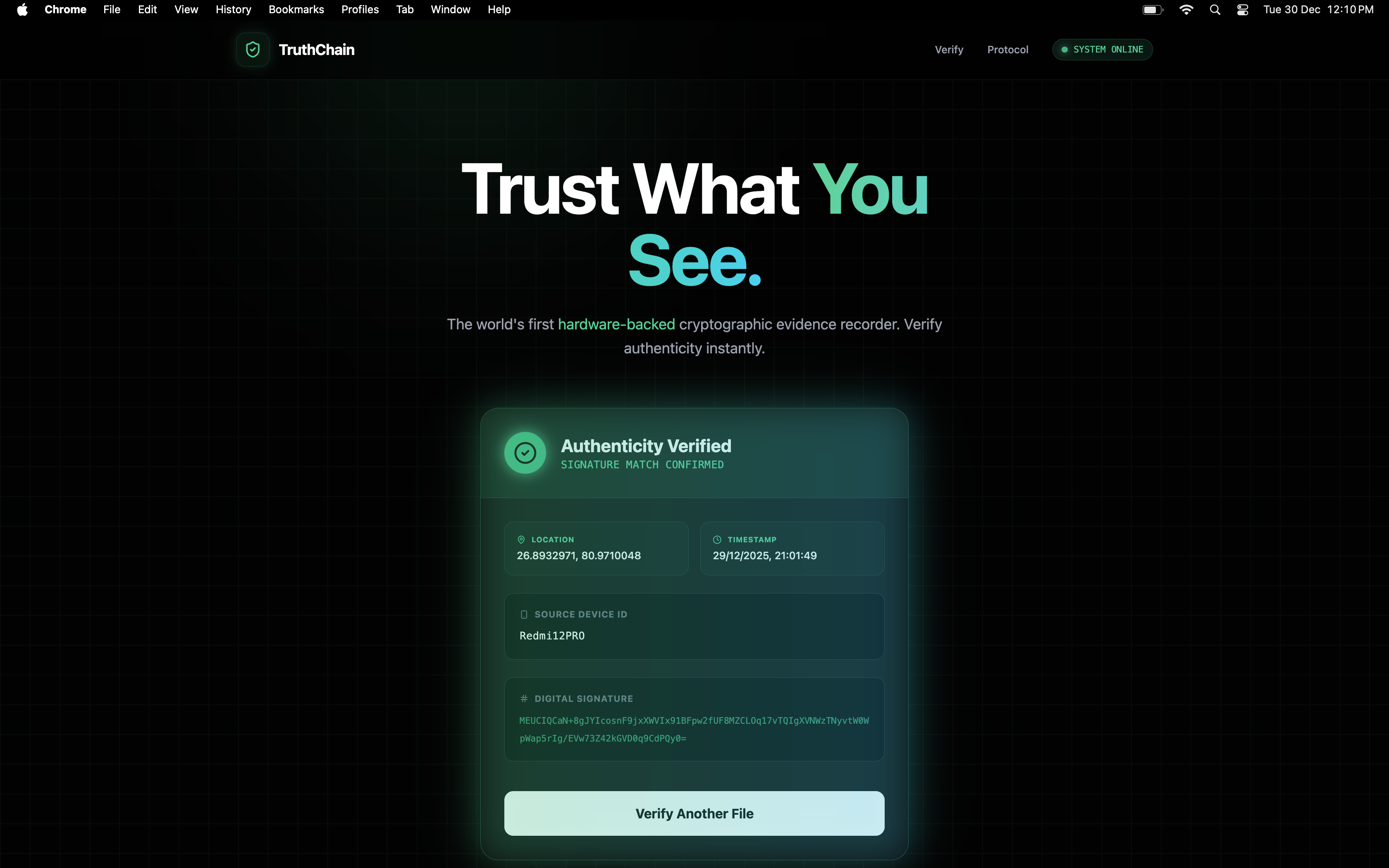 Capture: When you take a photo with my Android app, the phone's secure hardware chip instantly stamps it with GPS location, timestamp, and a cryptographic signature.