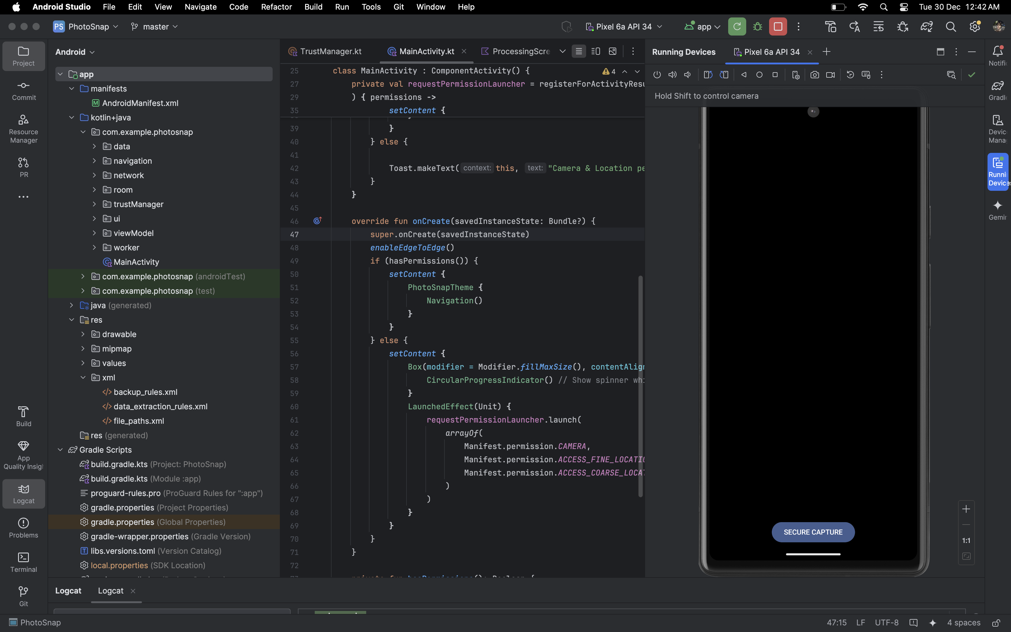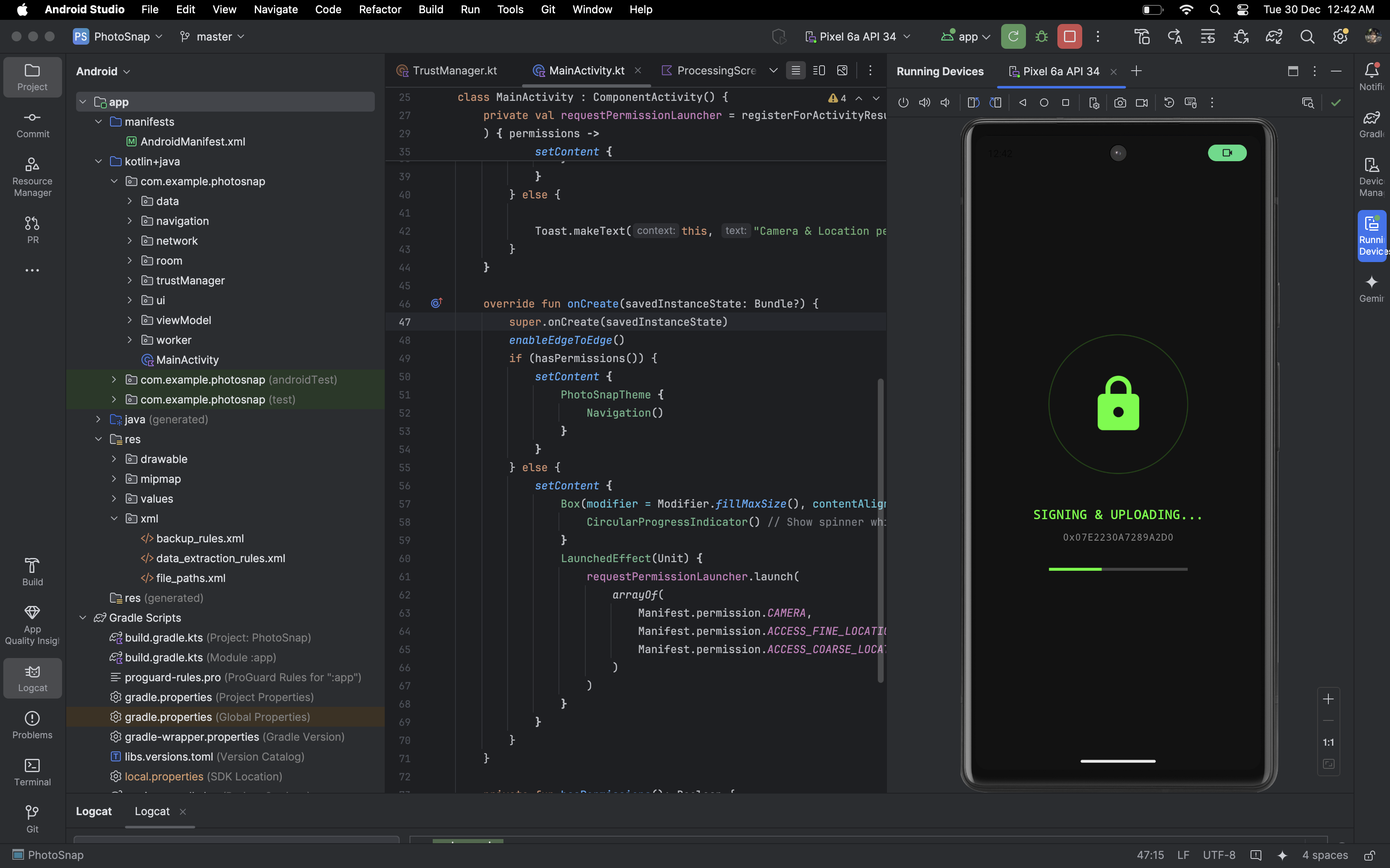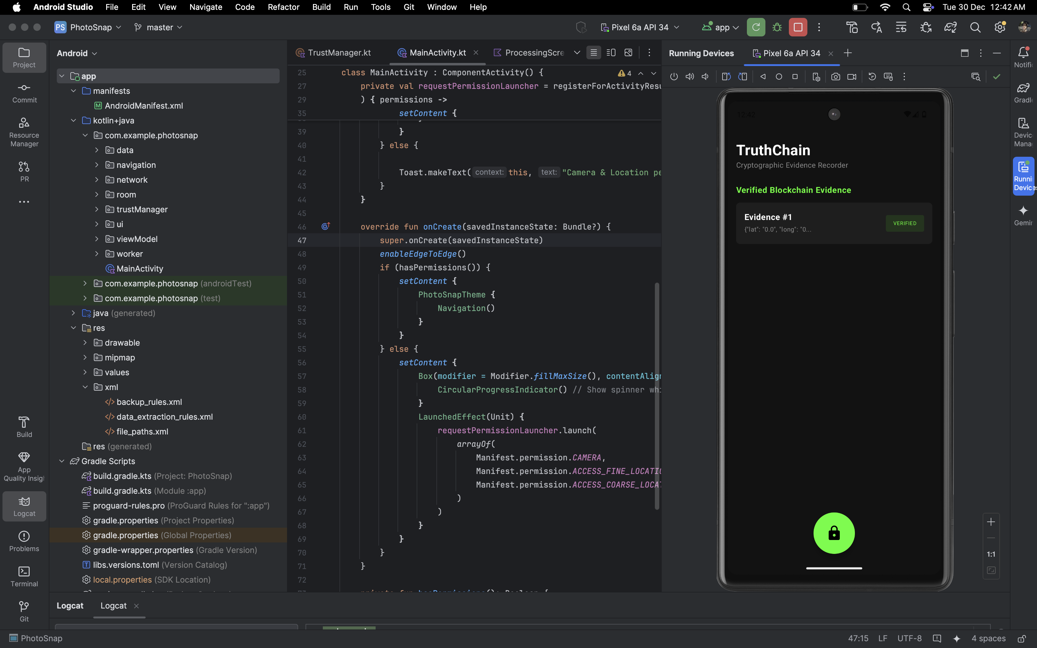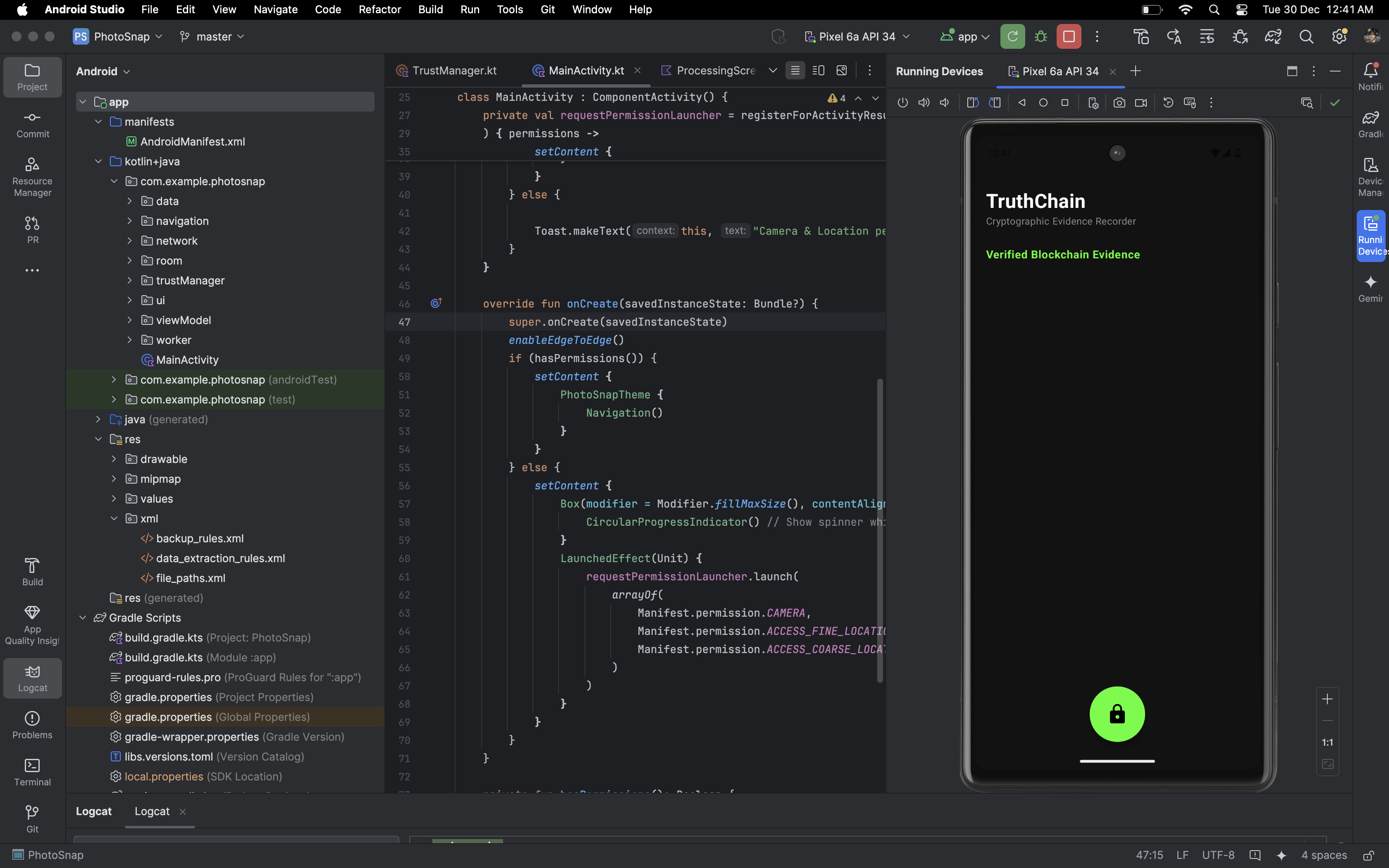 Android (The Source): I built the mobile client using Kotlin and CameraX. The core innovation is using the Android Keystore System to generate ECDSA signatures inside the Trusted Execution Environment. I also implemented WorkManager to queue uploads, ensuring evidence is saved even if the user loses internet connection.