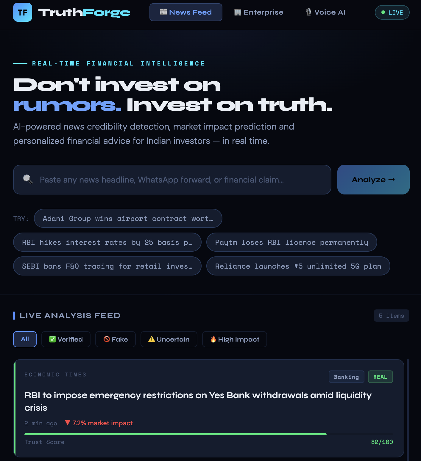 our webpage opening page Inspiration — the problem of financial misinformation and why it matters What it does — a clear walkthrough of how TruthForge works How we built it — frontend, AI core, real-time data, and the verification pipeline Challenges — grounding AI in facts, handling ambiguous claims, balancing speed vs. accuracy Accomplishments — what you shipped and why it's impressive What we learned — key takeaways around prompt engineering, UX, and data grounding Built With css3githubhtml5javascriptnode.jspythonreactvercel Try it out truthforge-rust.vercel.app github.com