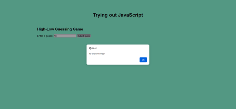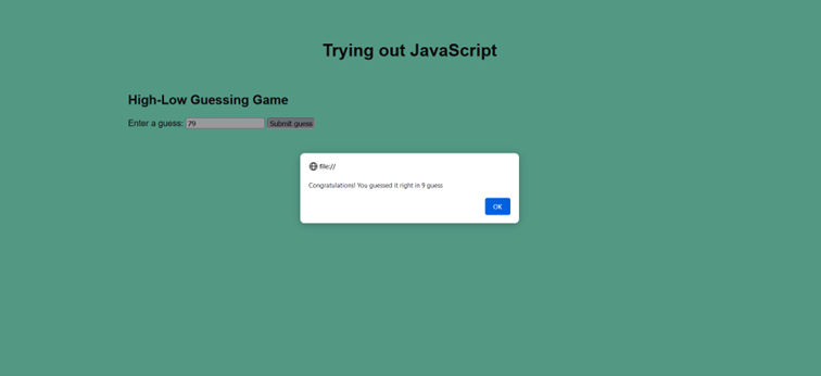 Trying out JavaScript is in no way a perfect project, but it is a beginner project which has a lot of potential for improvement. I focused rather on the second part of the project, so I didn't really give my best in designing the website. Besides, I think I should search for another solution for the second part to make the game more enjoyable. Also, I could add a list to the game which tells you what numbers you have already guessed. But that's up to the future.