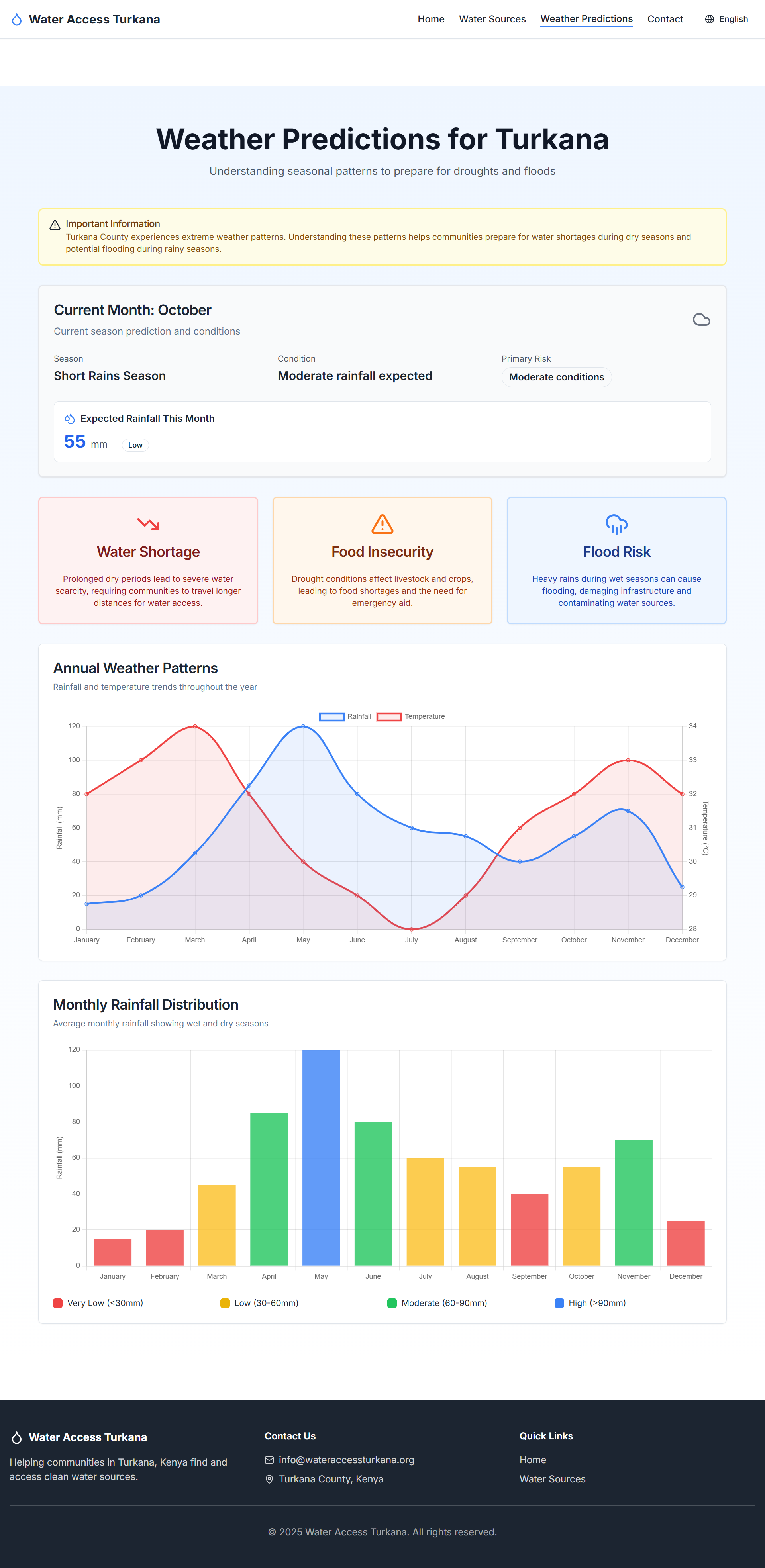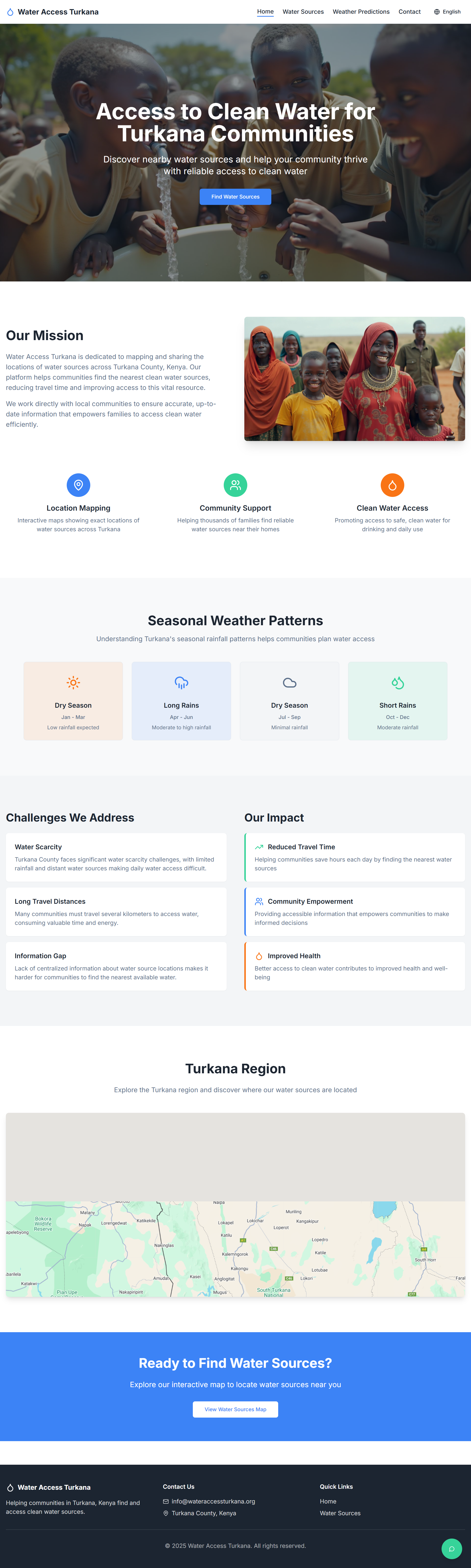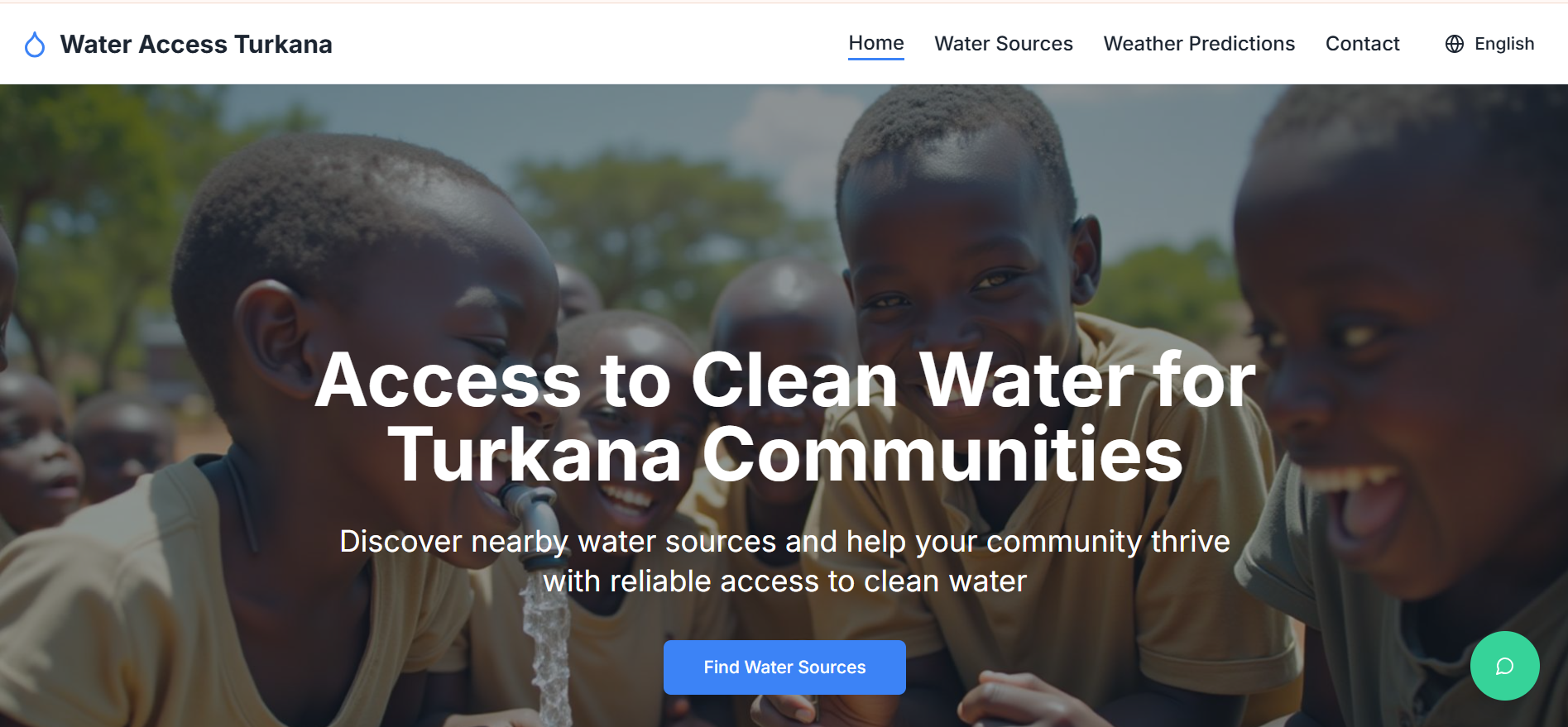 Shows all water points in Turkana (or demo locations) on a map. Provides directions to each water point using the user’s live location. Displays status of water points: available, under maintenance, or seasonal. Provides seasonal weather trends and drought/flood predictions using data analytics, ML, and NASA POWER API. Includes a chatbot that answers water- and weather-related questions and the wabsite text can update to languages such as Turkana, Kikuyu, Swahili, Kalenjin, Luo and English.