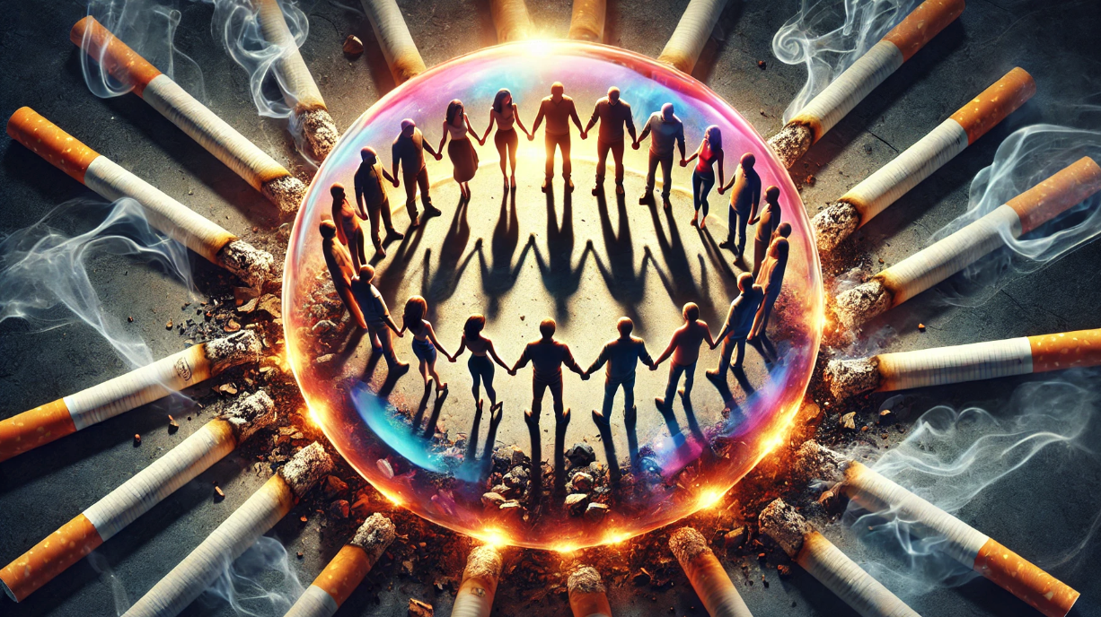 Create a scene focusing on a diverse group of individuals standing hand-in-hand in a tight circle, forming a strong, protective bubble of unity and hope. This bubble should be the focal point, radiating a warm, vibrant light that symbolizes a healthy community filled with joy, laughter, and well-being. The individuals should be depicted with their bodies angled inward, emphasizing their commitment to each other and their smoke-free environment. They are anchored firmly to the ground, exuding a sense of determination and strength. Outside the bubble, illustrate several cigarettes trying to penetrate the barrier but clearly being repelled by the glowing light. The cigarettes should appear dark, lifeless, and crumbling, with ominous shadows swirling around them to signify their harmful nature. Ensure the contrast between the vibrant bubble and the dull cigarettes is stark, making the cigarettes look increasingly desperate as they fail to breach the protective barrier.