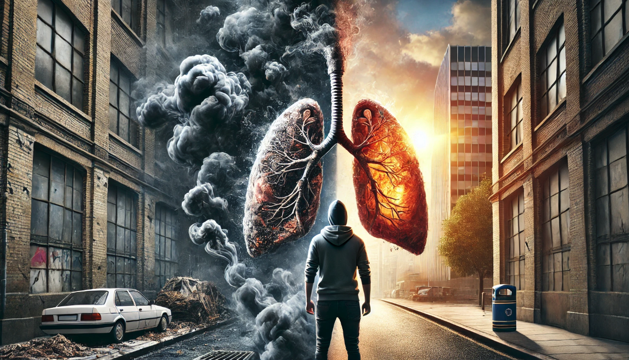 An urban street scene split into two halves. On the left, a person smokes, surrounded by thick, dark smoke that subtly resembles withered lungs. Their chest is translucent, showing blackened lungs. The environment is grim, with decaying buildings, graffiti, and a gray sky. On the right, the same person stands confidently in sunlight, their lungs glowing with health. The air is clear, and the surroundings are bright, with blue skies and vibrant trees. The smoke on the left side fades into clean air as it reaches the right, symbolizing recovery and hope.