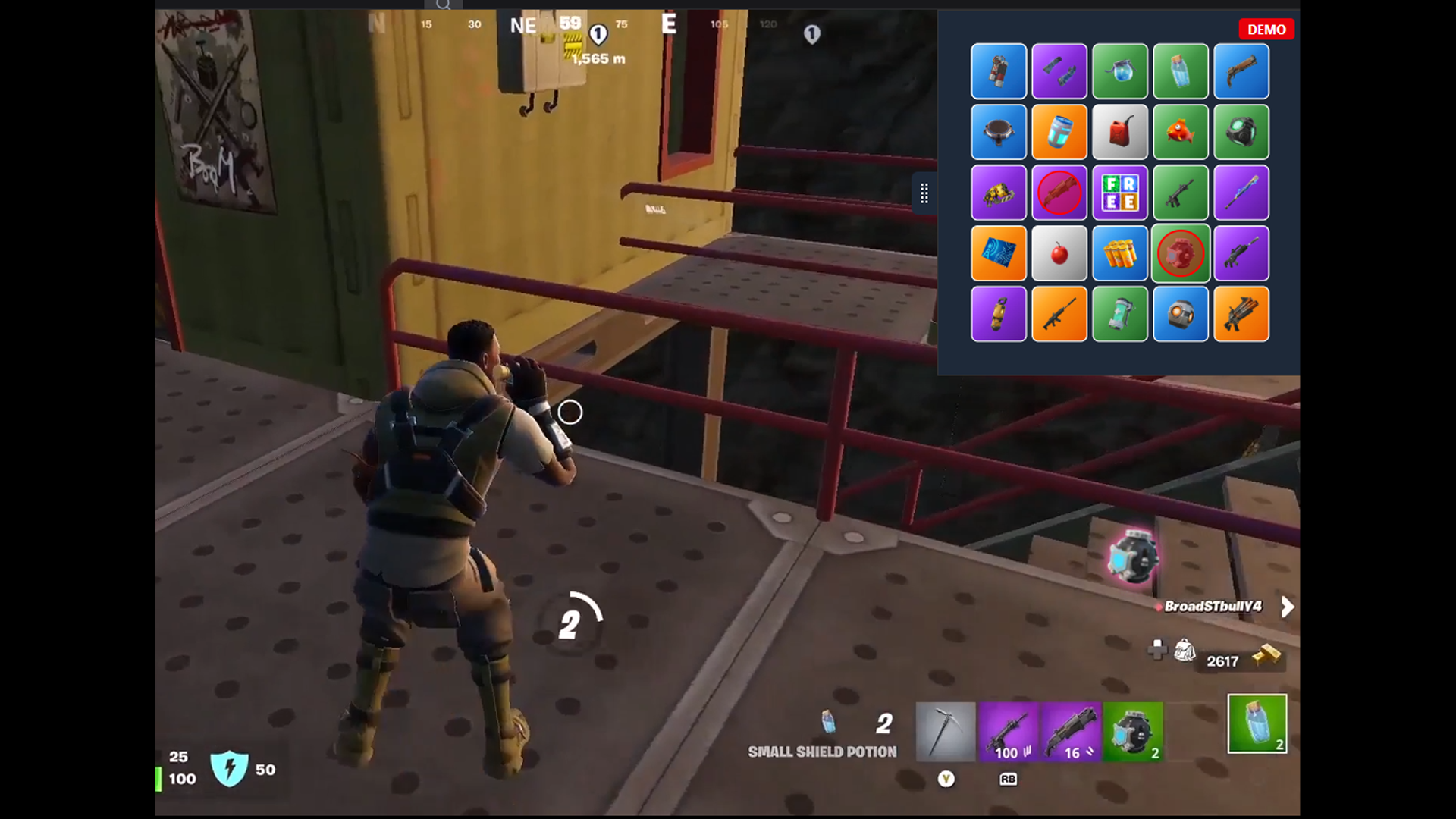 Twingo is essentially a Twitch Extension that overlays the stream with a transparent layer. This layer tracks where the Fortnite inventory UI is located and allows viewers to click on items as the streamer picks them up. Instead of traditional Bingo numbers, the card is filled with Fortnite inventory items. The Bingo card (or Twingo card) floats out from a tab in the upper-right corner and shows various Fortnite items.