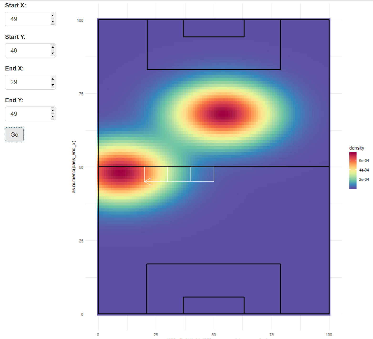 With a possession defined, we looped through all available seasons of MLS data provided by Opta and marked when each possession started and sequenced the corresponding passes. This data is then brought into an interactive R Shiny application that allows the user to define an “origin” and “destination” quadrant for a pass. The application then provides two heatmaps: one for where the next pass is likely to go and a second with completion percentage. These are currently generated from historical data, however, more in-depth data about defender position could be used to generate models of how the distribution changes with respect to defensive intensity or formation.