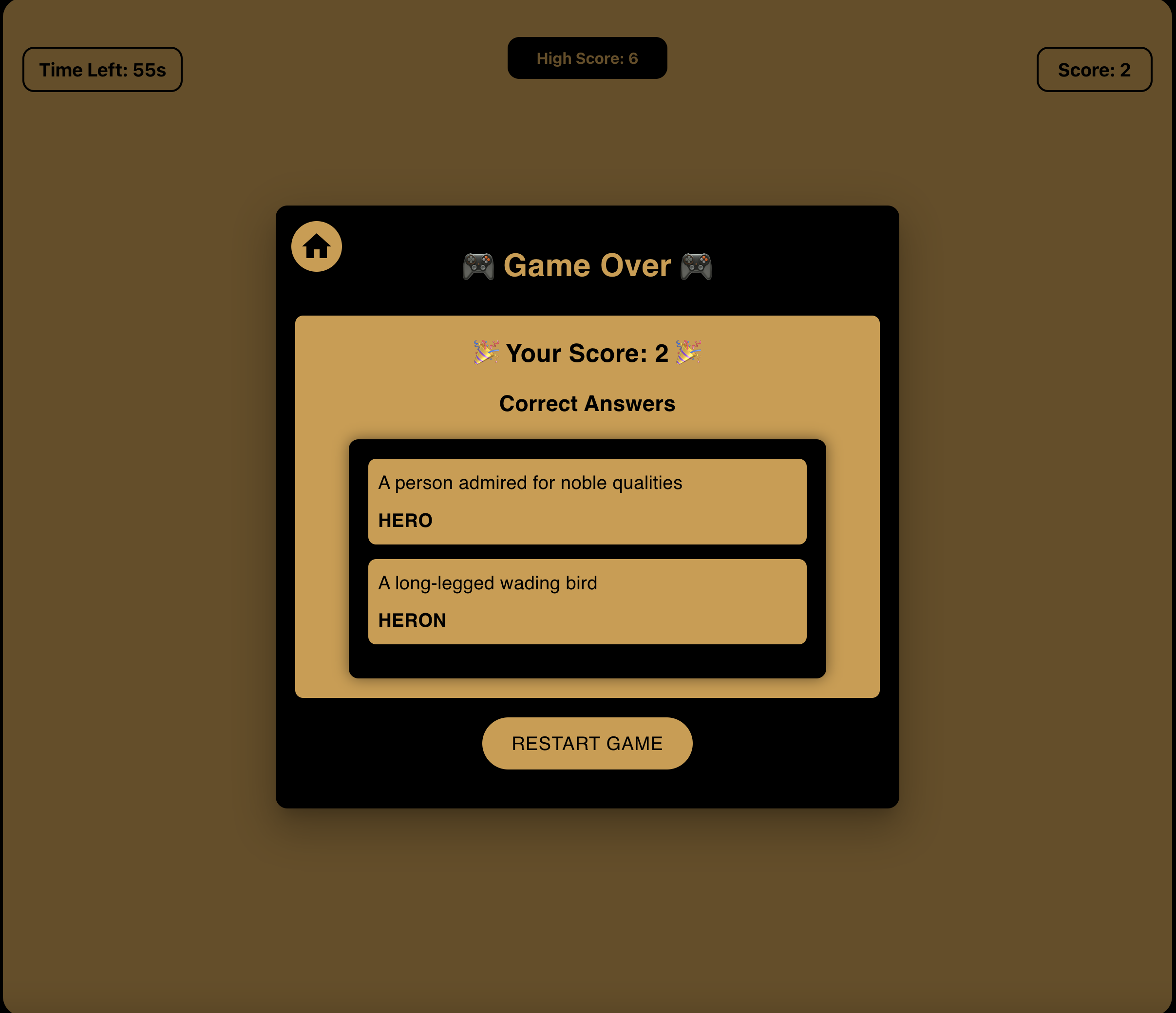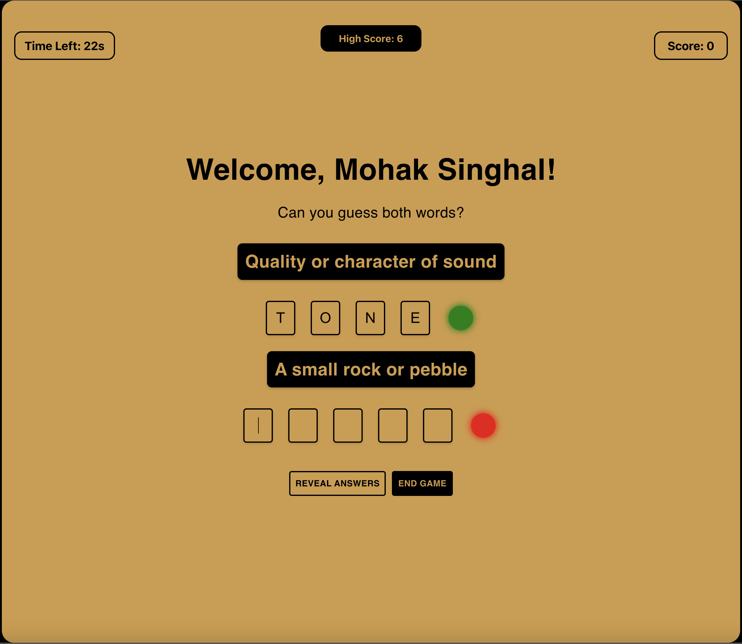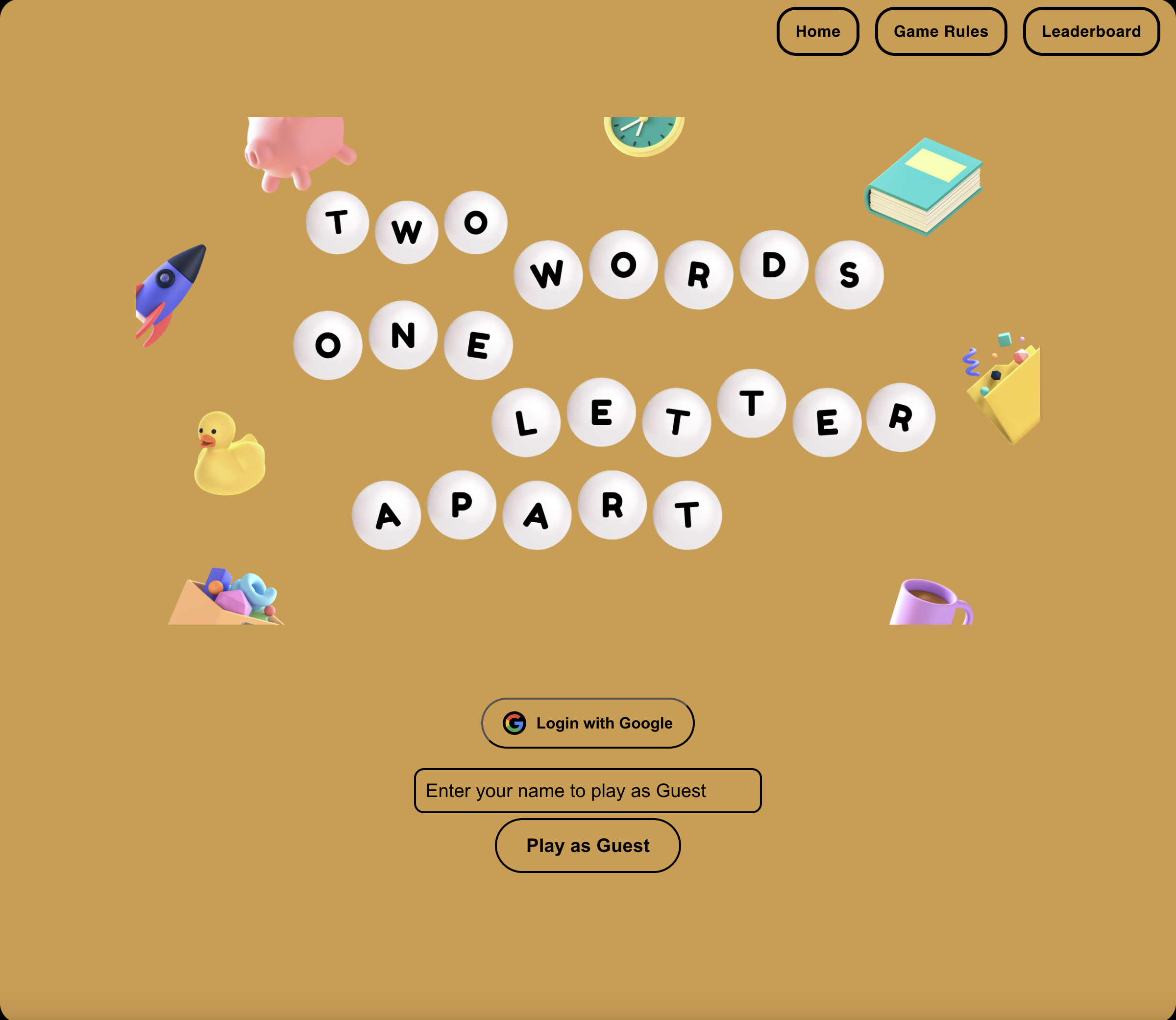 Two Words, One Letter Apart is a word puzzle game that challenges players to identify two related words where only one letter differs between them. Players are given clues for each word and must fill in the letters to solve the puzzle. The game features a timer to add excitement, a scoring system to track progress, and a leaderboard to encourage friendly competition. It's designed to be both entertaining and educational, testing linguistic skills while providing a sense of achievement with each completed pair.