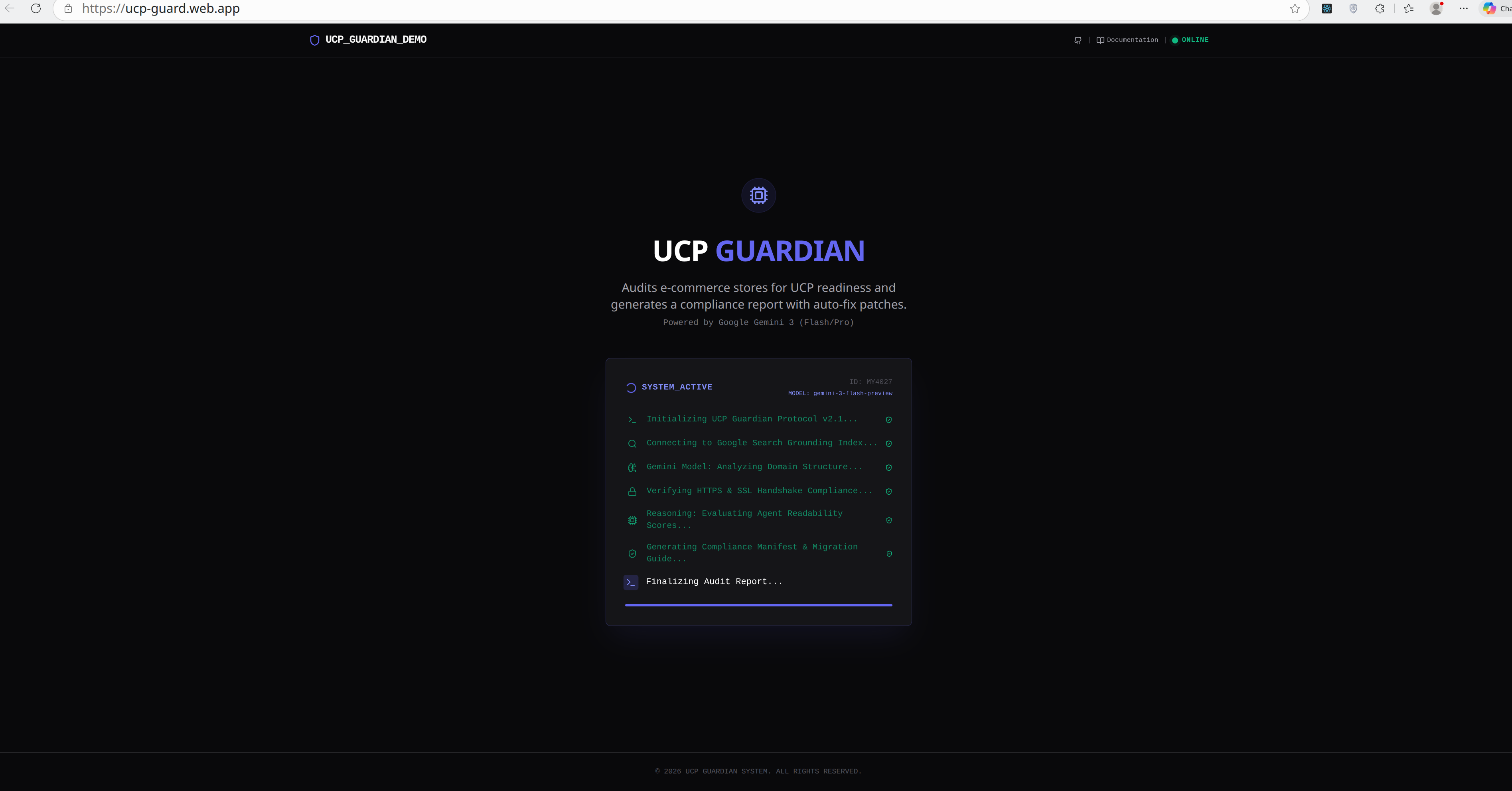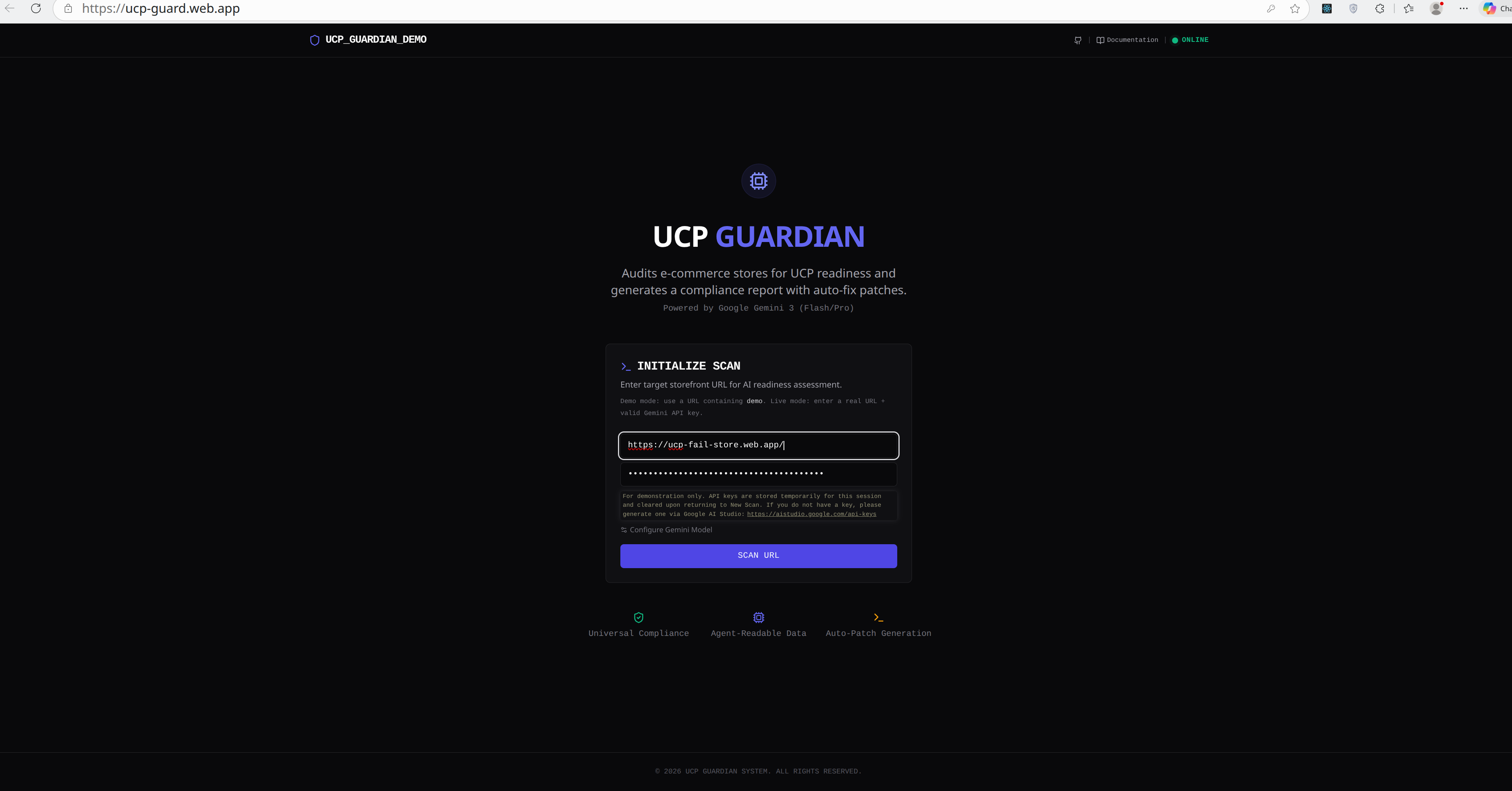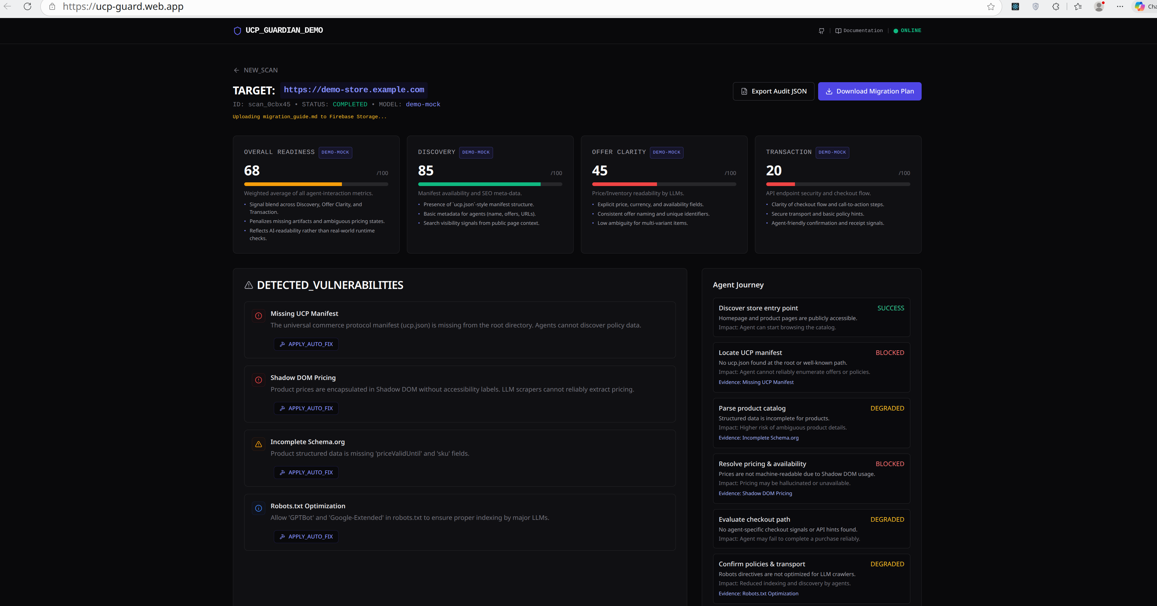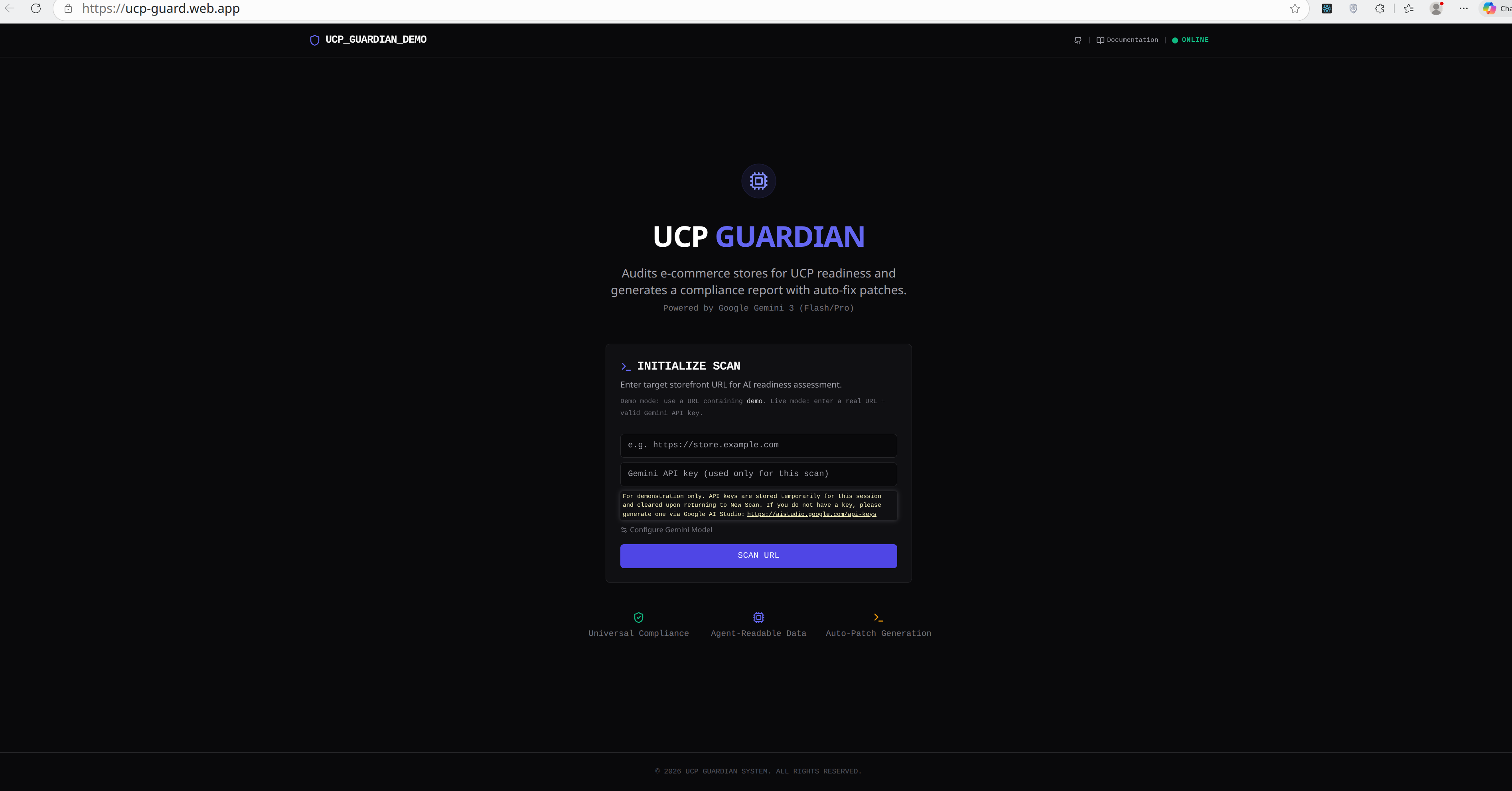 UCP Guardian is a demo auditing tool that evaluates how well an ecommerce storefront aligns with the Universal Commerce Protocol.