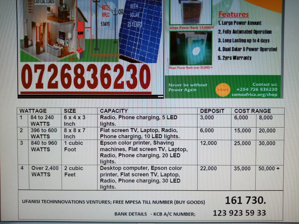 Much Higher Power at Lower Cost. The Ufanisi backup uses high capacity and high quality yet low-cost lead-acid batteries for power storage ranging from 84 watts to 4500 watts while competing products use low power expensive lithium-ion batteries of 6 to 22 watts at most.