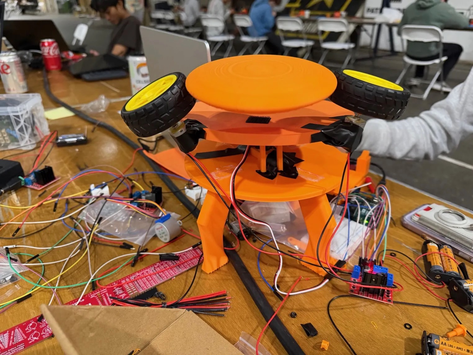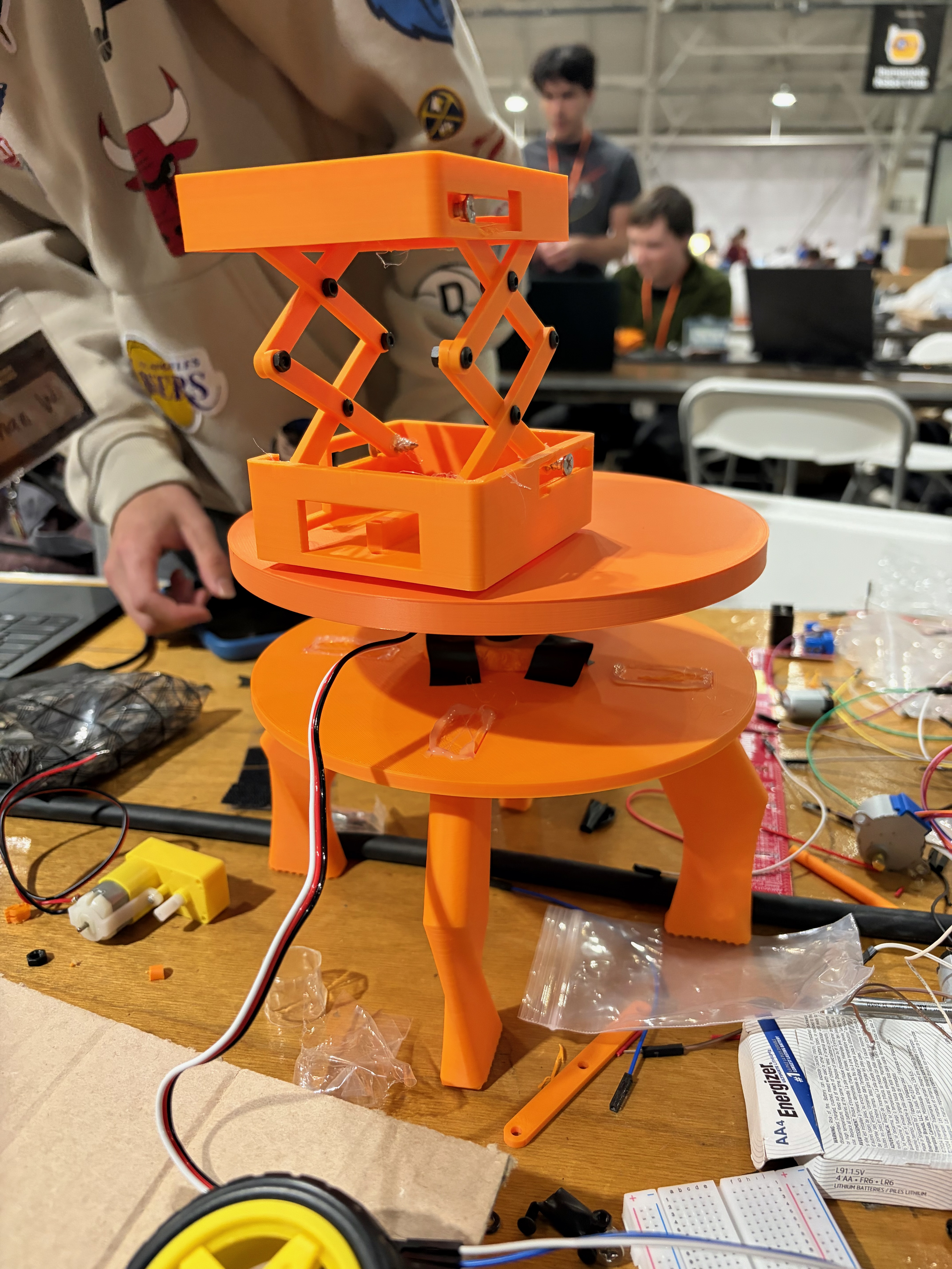 We built the Ulti-maker by using a power driver with batteries to power the two motors that spin the wheels. We have an additional servo motor that rotates the top plate. We are mounting the servo on a bottom plate with four legs.