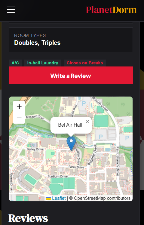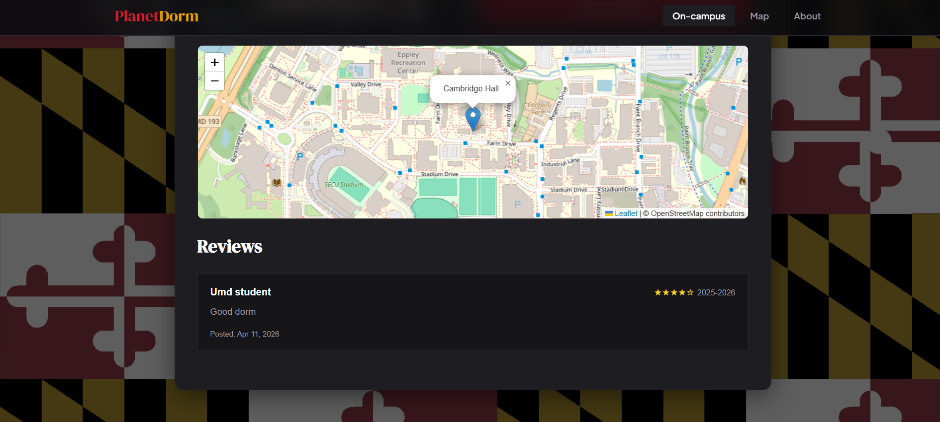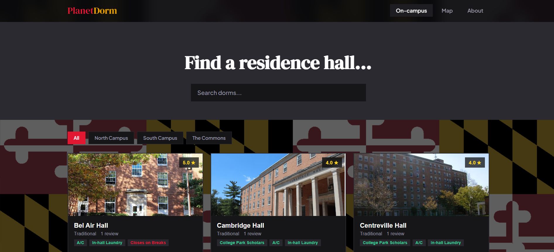 We were inspired to build this website on our search for dorms to live in next semester. We found it surprising how difficult it was to find useful information about the dorms, including a lack of pictures and very little community feedback. As such, we have decided to build this website in hopes of making the search for living places easier for students of UMD.