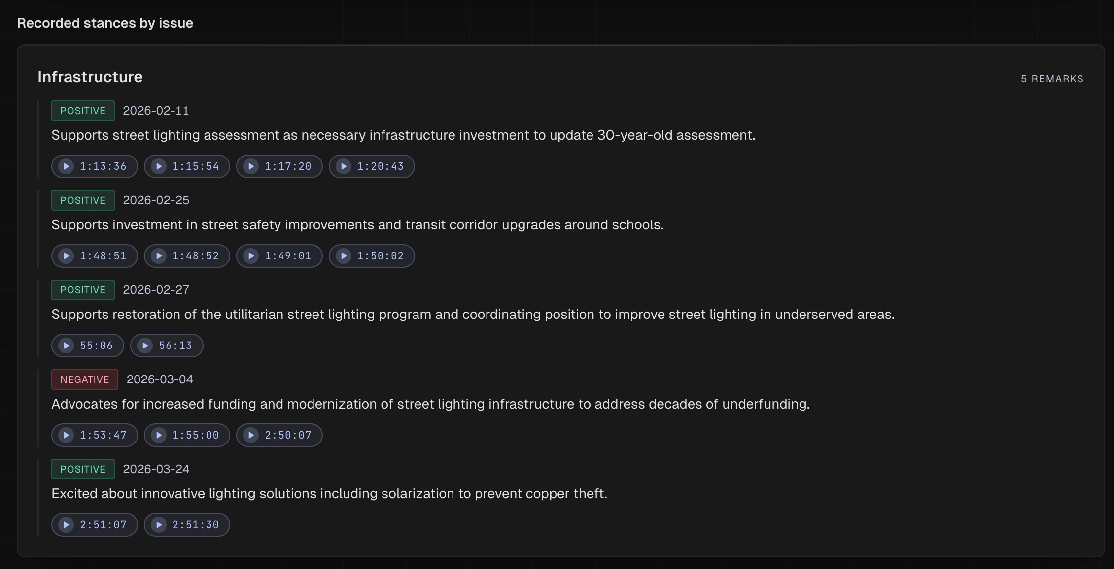 - Stated positions: recurring issues they speak on, their stance on each, with clickable timestamps into the source video