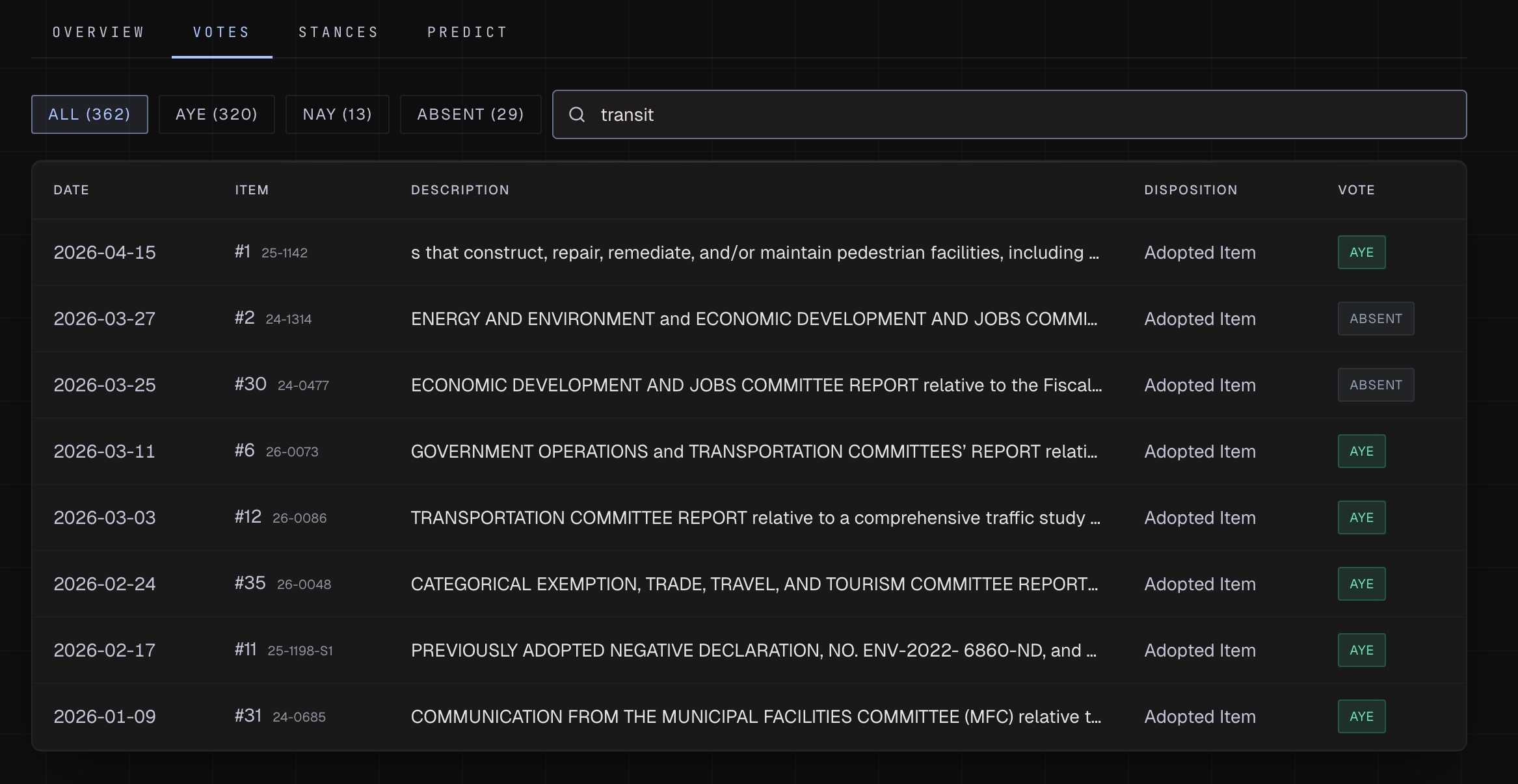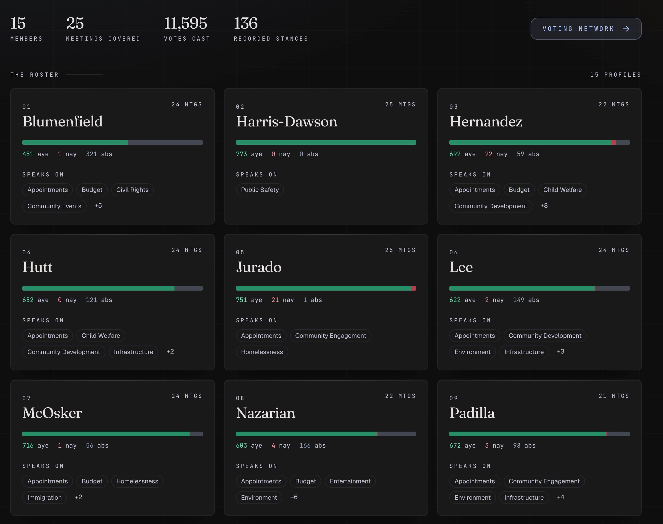 Every Tuesday, Wednesday, and Friday at 10am, 15 elected officials vote on decisions that shape daily life for four million Angelenos: zoning approvals that determine where housing gets built, budget allocations that fund or defund public services, and permit votes that define what neighborhoods look like for decades. These decisions happen in public. But for the vast majority of residents, they are functionally invisible.