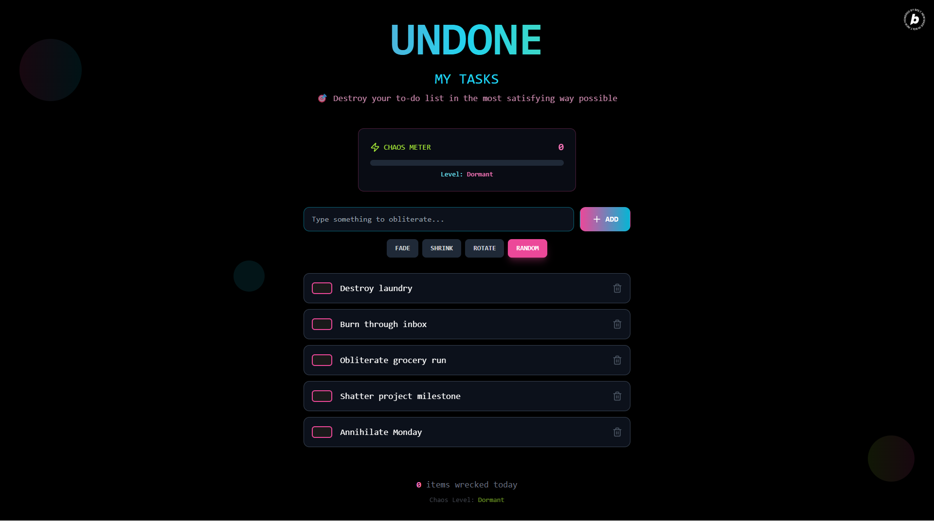 Undone My Tasks is a rebellious take on productivity that turns your boring to-do list into an epic destruction simulator! Instead of mundane checkboxes, you get to vaporize tasks with satisfying animations - fade them away, shrink them into oblivion, or send them spinning into the void. Each destruction adds to your "Chaos Meter," tracking your progress from "Dormant" to "Apocalyptic" levels. It's like having a personal task-destruction arcade in your browser!