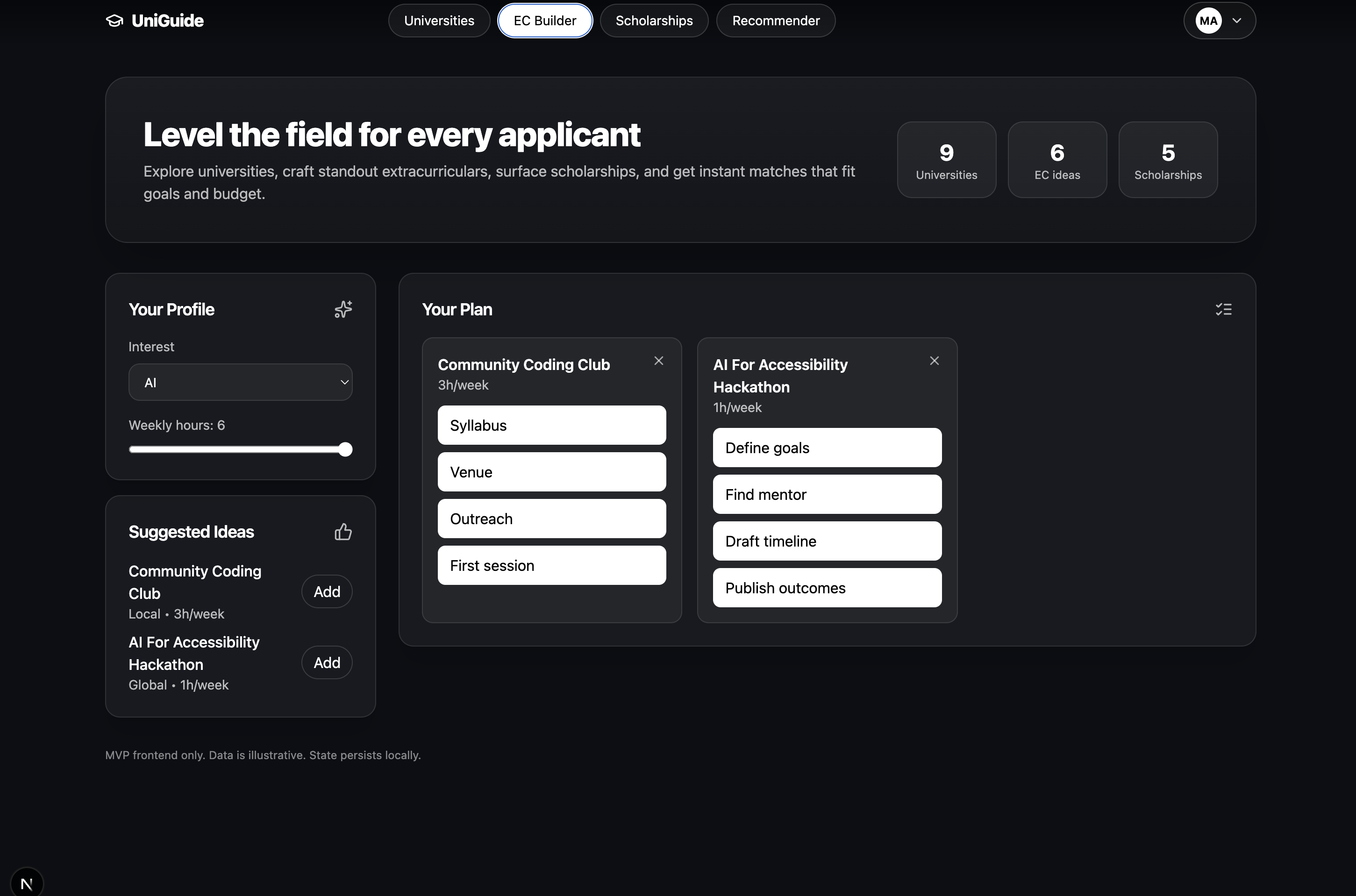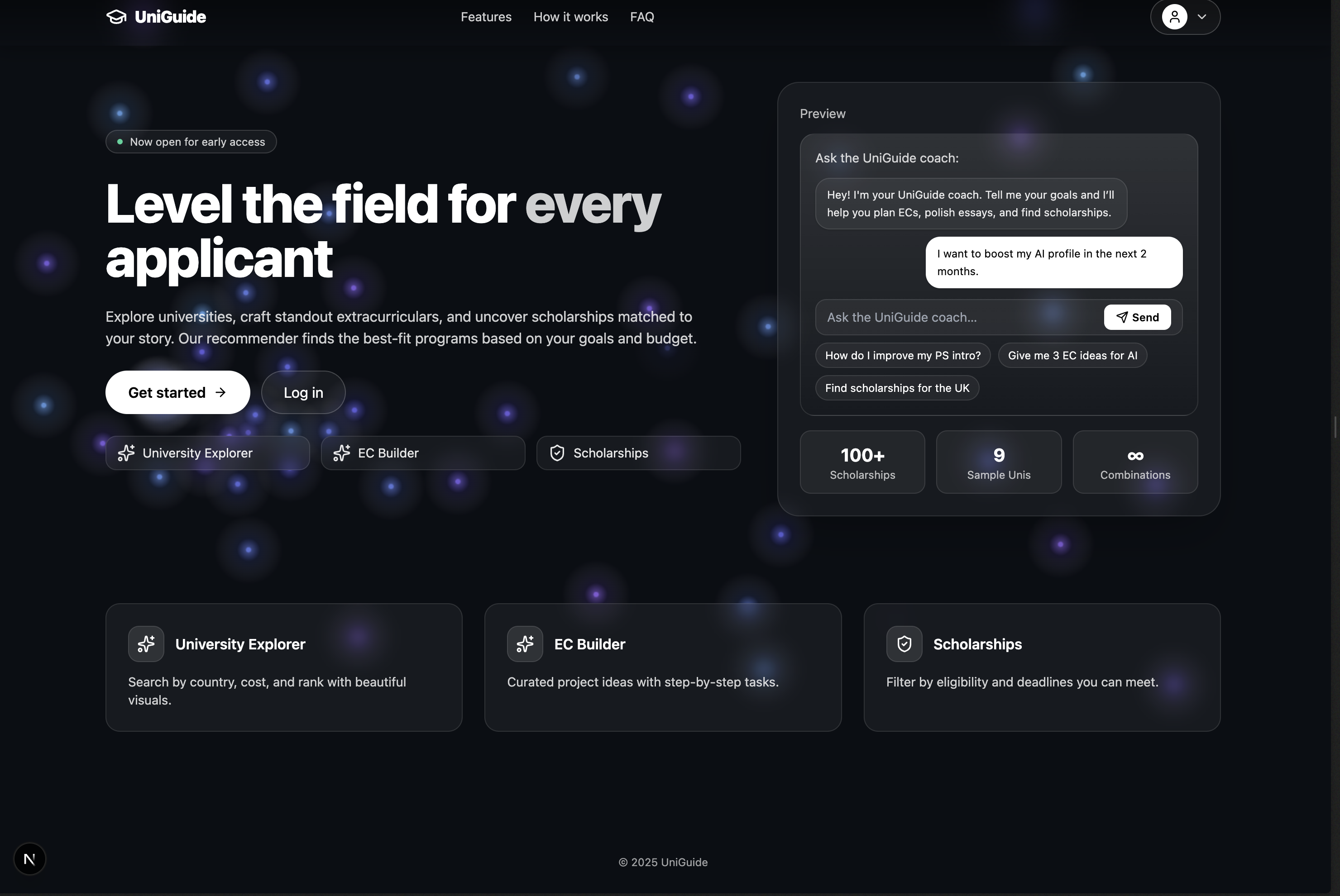UniGuide offers a university explorer that matches each student with a university based on filtered costs, location, and rank, removing the initial hassle of spending hours researching options and allowing them to focus on preparing strong applications instead. It also provides an extracurricular builder, which opens each student to a plethora of opportunities for different fields of study. Last but not least, UniGuide provides a scholarship finder, which categorizes local and global scholarships, tailored for each student's needs. All of these features are paired with an on-board, custom-trained LLM chatbot that interacts with the student and provides explanations to any relevant queries.