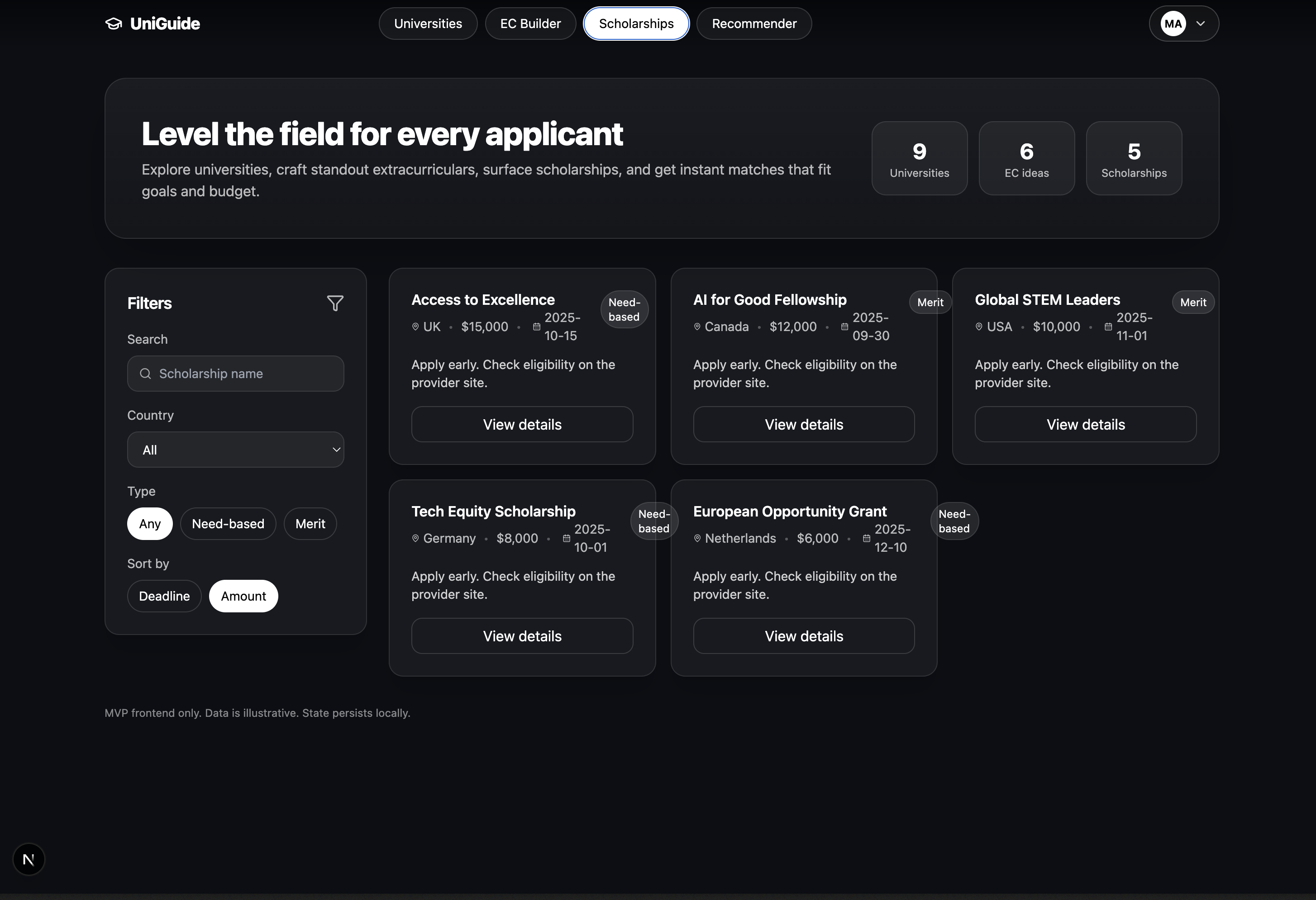 We’re proud that UniGuide gives underprivileged students tools that are usually only available through expensive private counselors. Creating a functional university explorer and scholarship matcher within a short timeframe showed us the impact technology can have when designed for inclusivity.