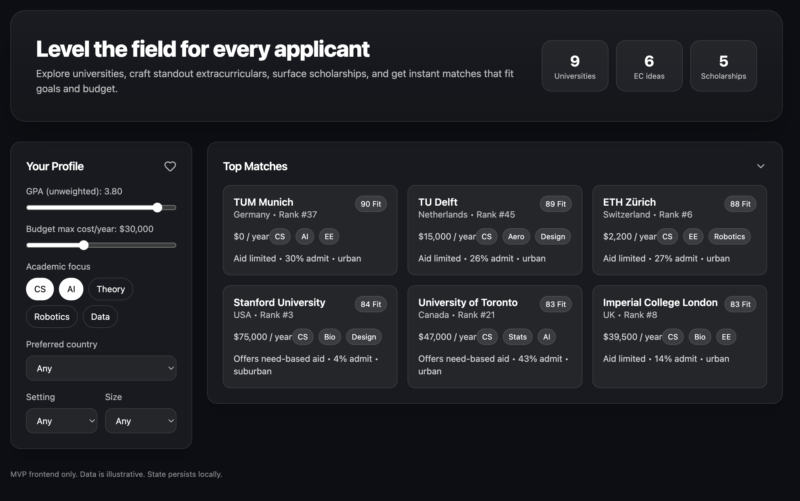 While currently going through the European university application process ourselves, we found that the application system is overly complex, time-consuming, and often biased toward students with access to resources and support. Many of these students lack the guidance, networks, and financial support that wealthier peers take for granted, leaving talent and potential overlooked. This becomes especially true for young adults who need to balance school with other occupations, such as part-time jobs, in order to financially sustain themselves. That's where we decided to step in and develop a solution that