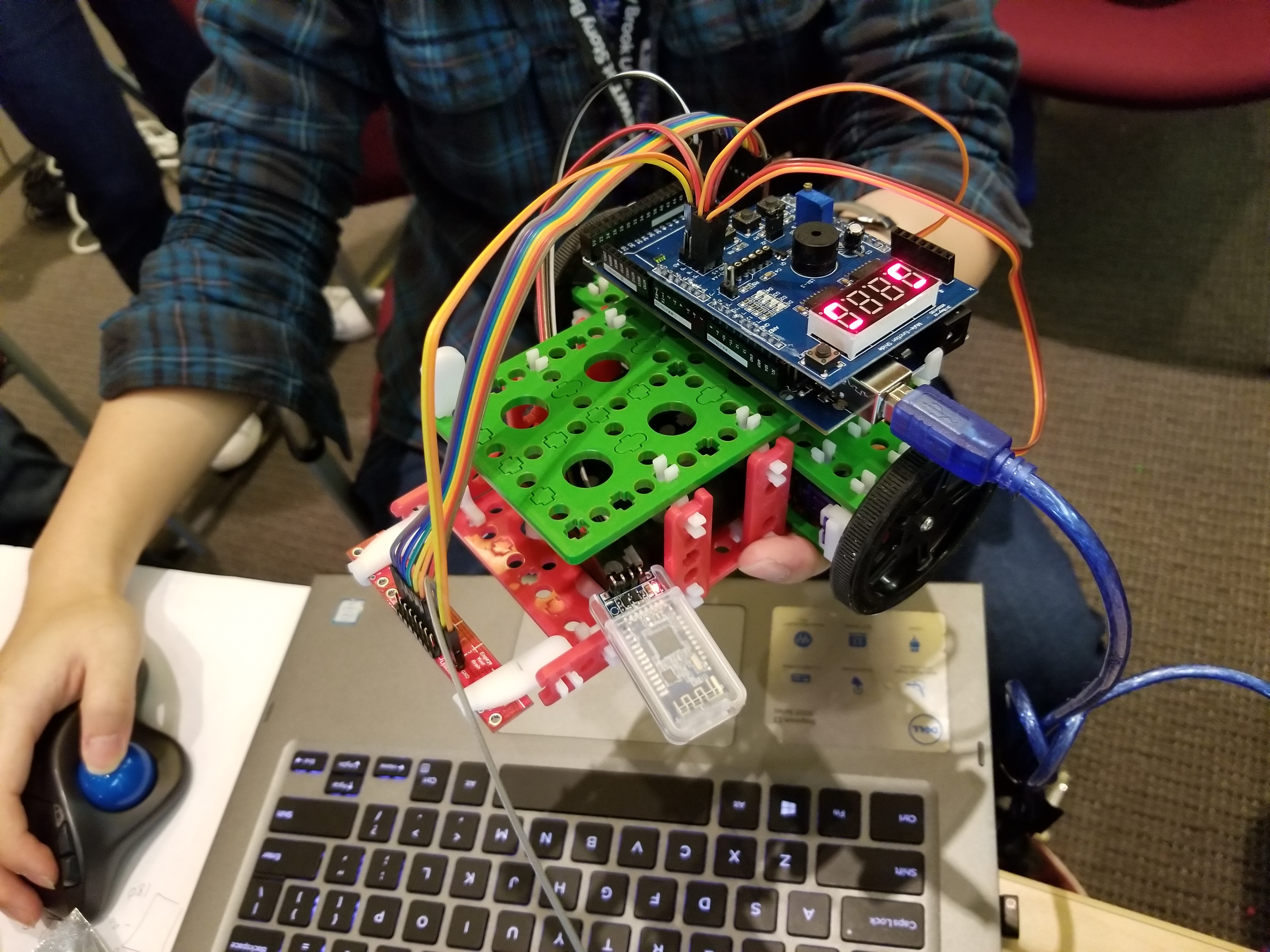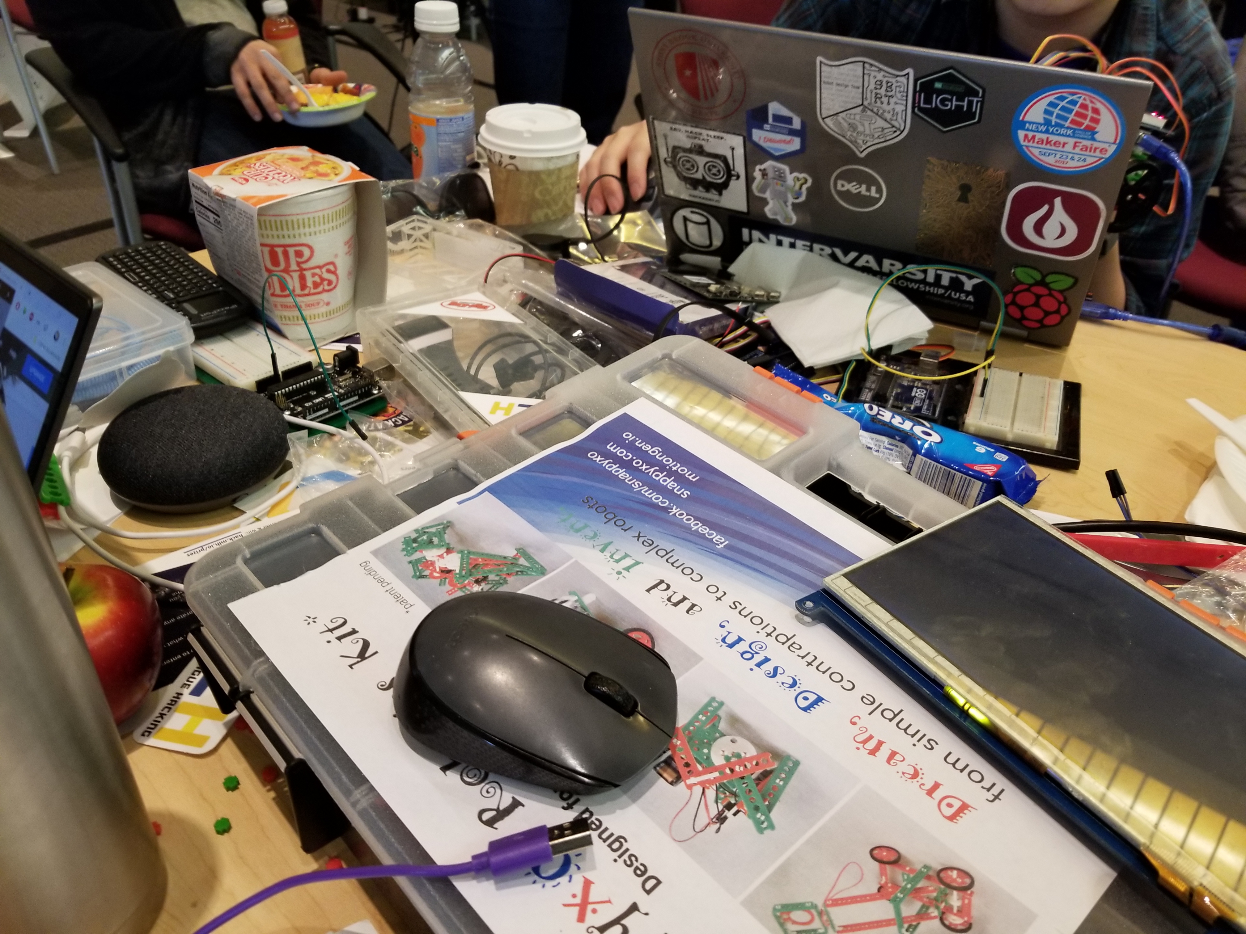 We used Arduino and SnappyXO kit and a number of sensors (Ultrasonic, Temperature, Humidity, LDR) to create a robot able to solve the maze challenge, as well as explore the environment and interact with it and the members of family. We used Raspberry-Pi and its camera to run Face Detection algorithm that distinguishes between different family members, as well as detects unknown people and activates an alert. Also, we implemented mapping of sensors' data into Unity and its visualization in real time. For the Health Care bot, the app engine, Google Cloud storage, Softheon workshop UI, DialogFlow, Firebase were used - to create a personalized care-receiving experience.