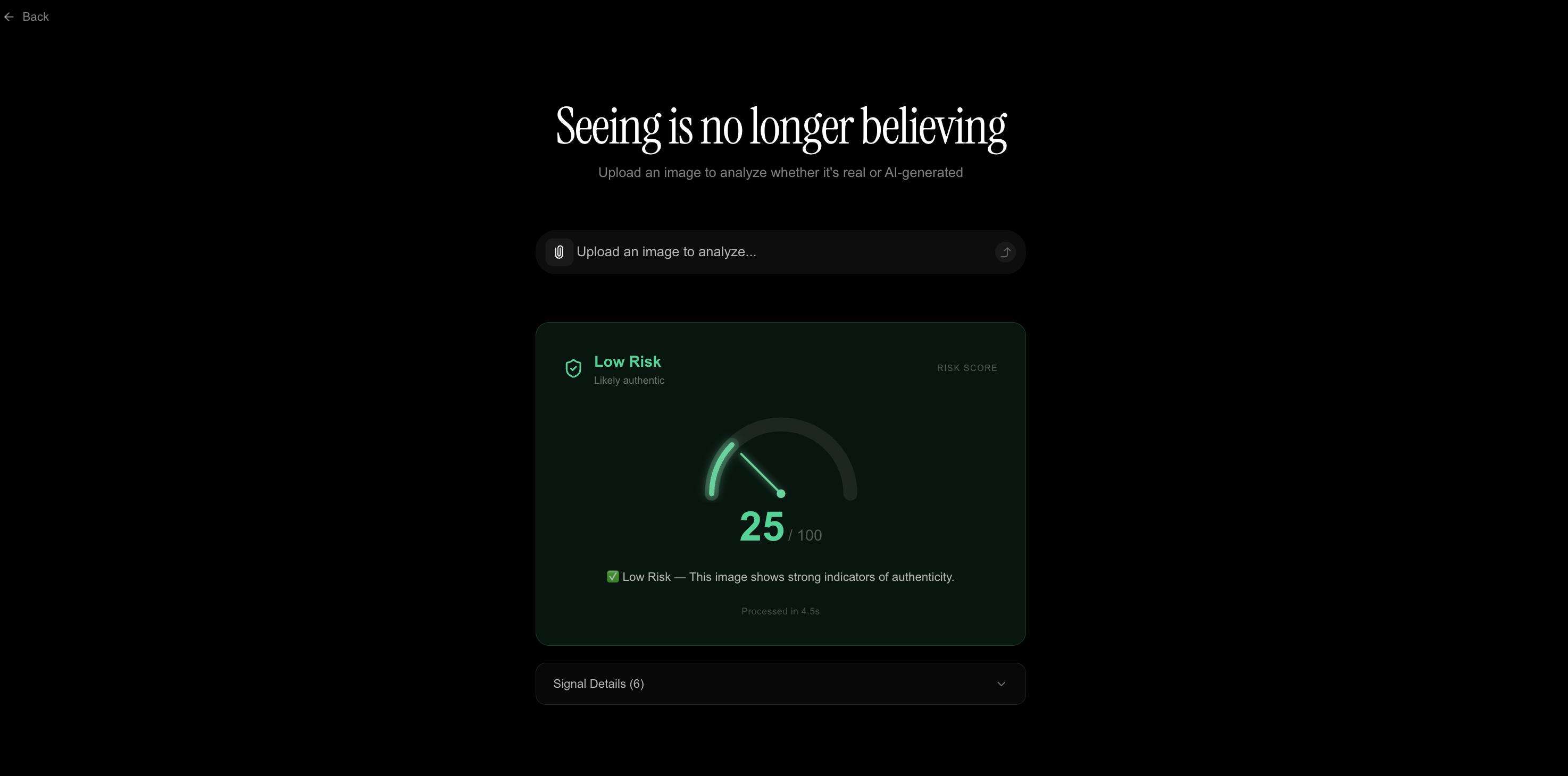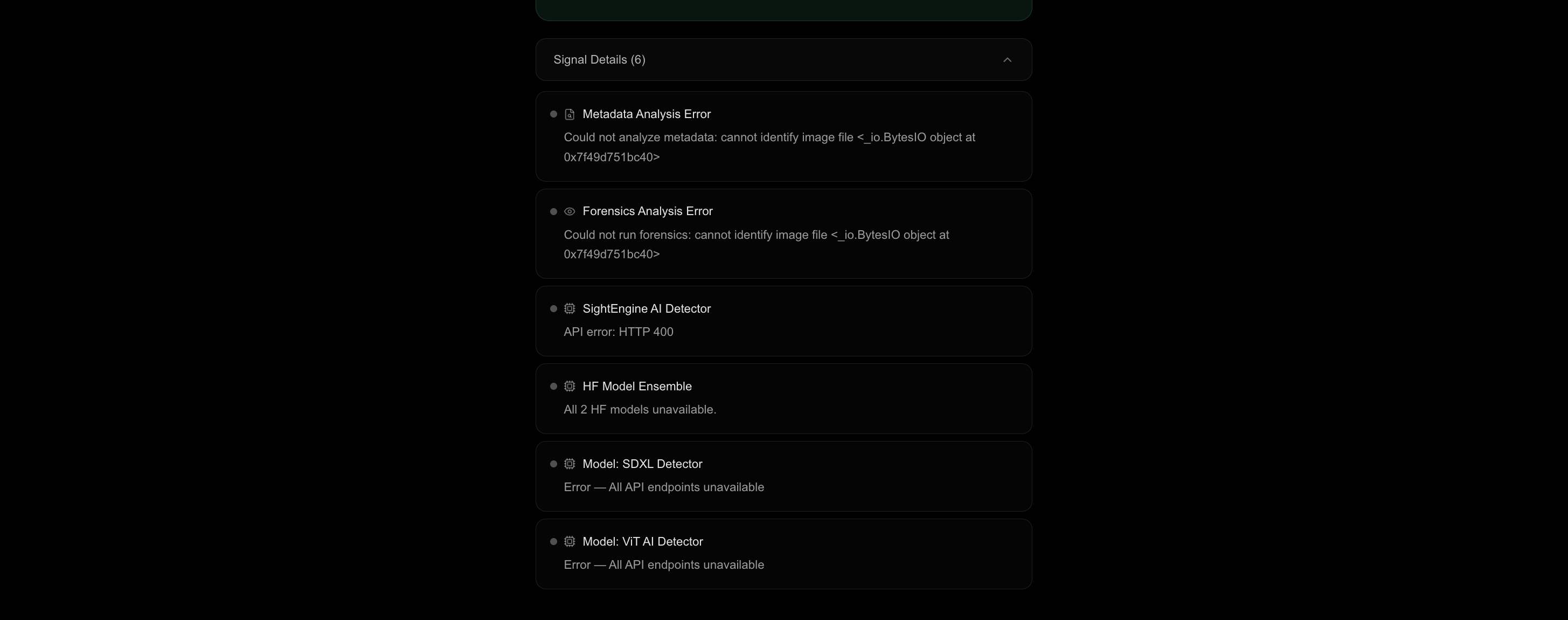 - Scoring weights — Balancing metadata, forensics, and AI detection took iteration. We added confidence weighting so high-confidence signals matter more.