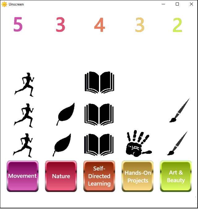 Parents and kids set goals for the day. Unscreen tracks and displays how much a family participates in each category and let's them know when they've met their goal for the day.