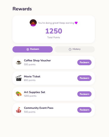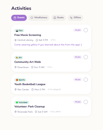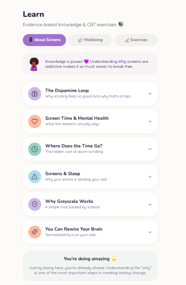 We used Lovable to develop a minimum viable product. The app’s features were informed by behavior change frameworks, including the COM-B model, Acceptance and Commitment Therapy (ACT), and Cognitive Behavioral Therapy (CBT). Supporting evidence was reviewed both prior to and during the event, and the project was developed over the course of the competition. In the design process, we took inspiration from the features and visual layouts of several different existing apps, including BetterPoint and Duolingo.