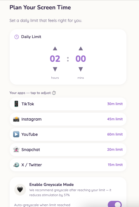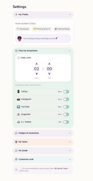 We plan to collaborate with software developers to build out the app’s back-end and integrate APIs that enable secure, privacy-conscious access to smartphone usage data. We also aim to localize the app for non-English-speaking regions by adapting features and nudges to be culturally relevant and inclusive. For the distribution of the app, we plan to introduce the app via partnerships with local educational institutions.