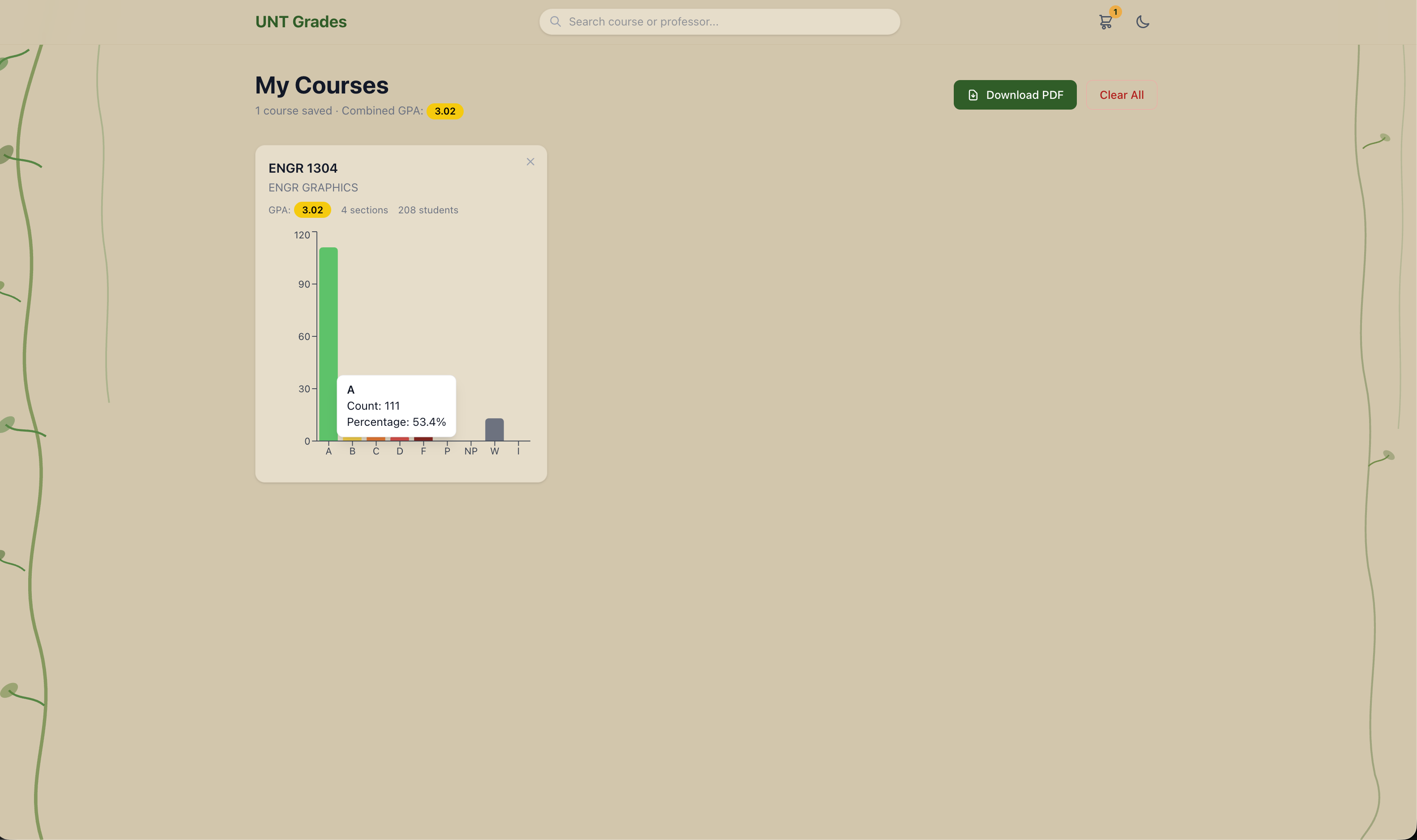 Allows you to view the different classes, sections, and professors at UNT with their respective grade distributions from last semester. You can also add classes to the "shopping cart" and export them to a PDF for future reference. And, you can share the link to certain classes or sections taught by professors.