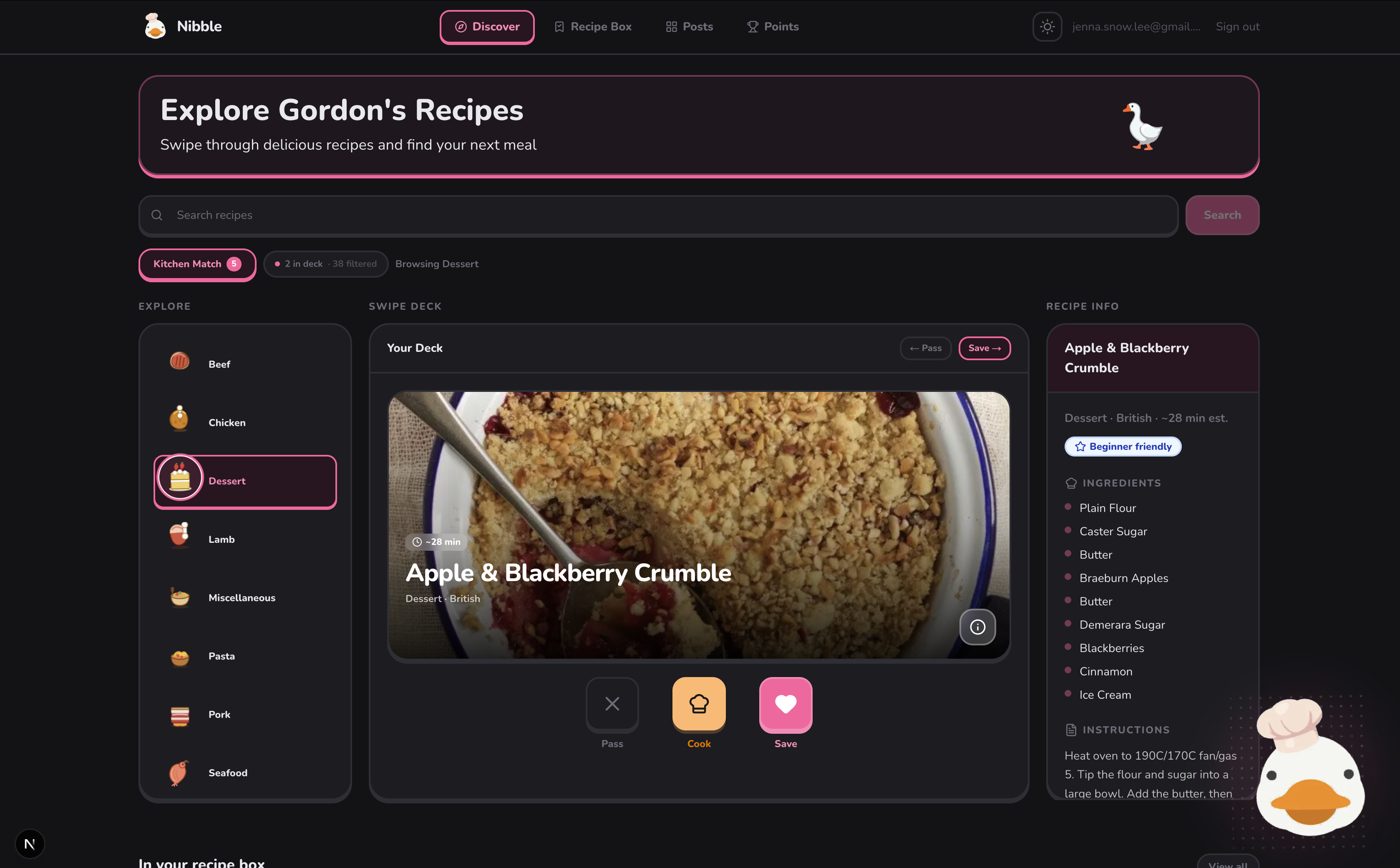 Swipe to discover: Recipes are presented in a swipe-based interface so you can quickly browse, save ones you like, and skip ones you don’t. Kitchen Match (Pantry Mode): You can enter ingredients you already have, and the app filters recipes down to what you can actually make. Companion Mode (Gordon the Goose): When you start cooking, the app can read recipe steps out loud and guide you through them. You can also ask questions while cooking (like substitutions or technique help) and get spoken responses that are aware of the recipe context.